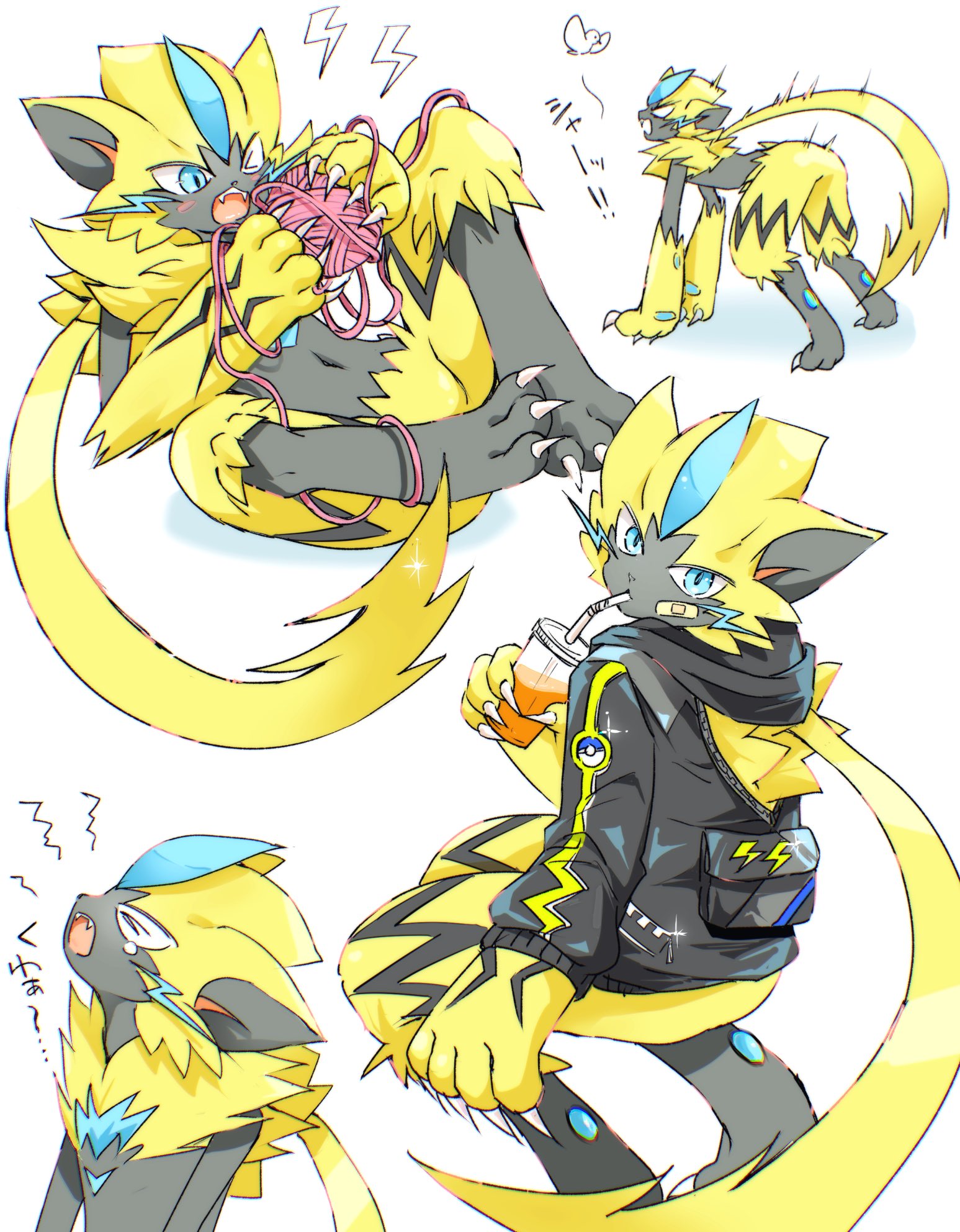 all_fours animal_ears bird blue_eyes blush cat_ears claws closed_eyes drinking_straw furry gen_7_pokemon hakata_no_kuma highres jacket legendary_pokemon markings mythical_pokemon navel nintendo open_mouth pokemon pokemon_(creature) yarn yarn_ball yawning zeraora