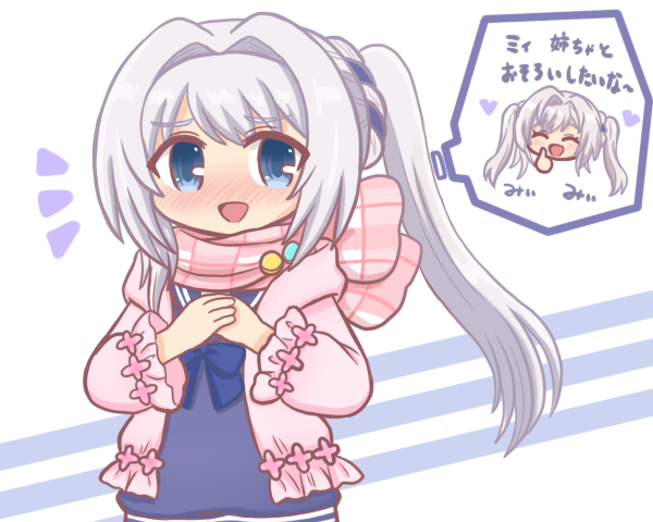2girls :d bad_id bad_twitter_id blue_bow blue_bowtie blue_dress blue_eyes blush bow bowtie closed_eyes cosplay dress grey_hair hair_intakes jacket long_hair long_sleeves looking_at_viewer magia_record:_mahou_shoujo_madoka_magica_gaiden mahou_shoujo_madoka_magica multiple_girls notice_lines open_mouth own_hands_together pink_jacket pink_scarf plaid_clothes plaid_scarf ponytail reverse_(bluefencer) sailor_dress scarf sidelocks smile translation_request twintails yakumo_mikage yakumo_mikage_(cosplay) yakumo_mikage_(winter_costume) yakumo_mitama