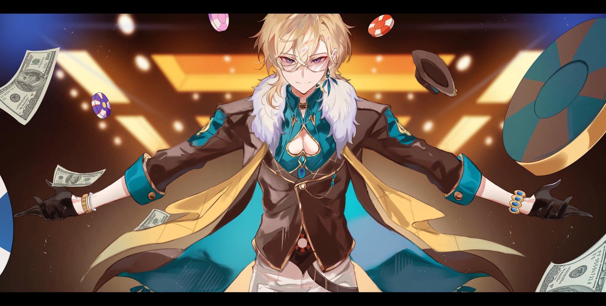 1boy aventurine_(honkai:_star_rail) banknote black_border black_gloves black_jacket blonde_hair blue_eyes blue_shirt border bracelet clothing_cutout coin earrings fur_trim glass gloves hair_between_eyes half_gloves hat highres honkai:_star_rail honkai_(series) indoors jacket jewelry kinoerou long_sleeves looking_at_viewer male_focus money multicolored_eyes pants purple_eyes shirt smile solo spade_cutout unworn_hat unworn_headwear white_pants