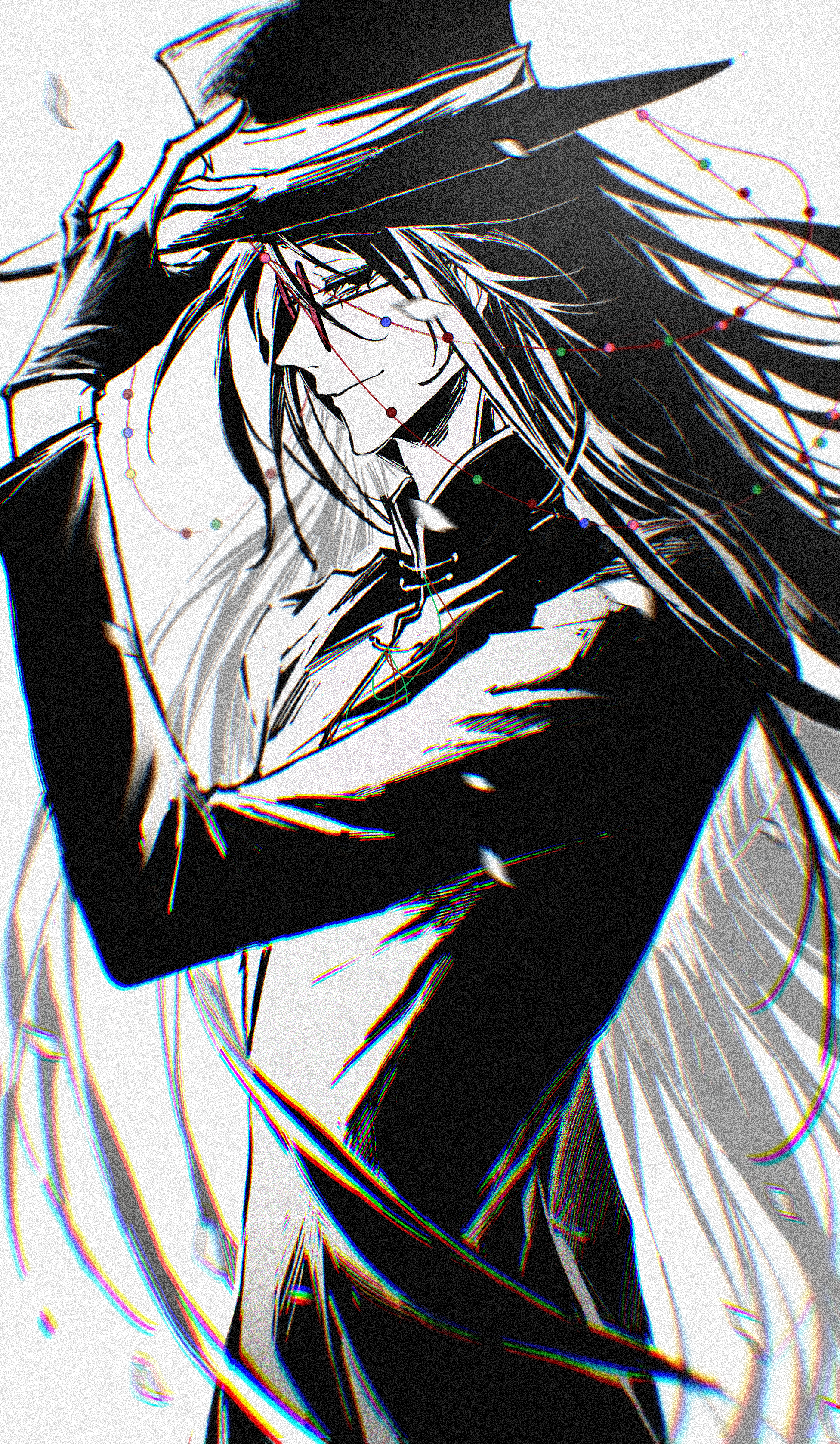 1boy absurdres beads chinese_commentary chromatic_aberration closed_mouth commentary_request from_side gloves greyscale hand_on_headwear hat highres huai_yunqing long_hair long_sleeves male_focus mandarin_collar monochrome pink-tinted_eyewear shiyu_sandu smile solo spot_color tinted_eyewear touqi_guaitan upper_body