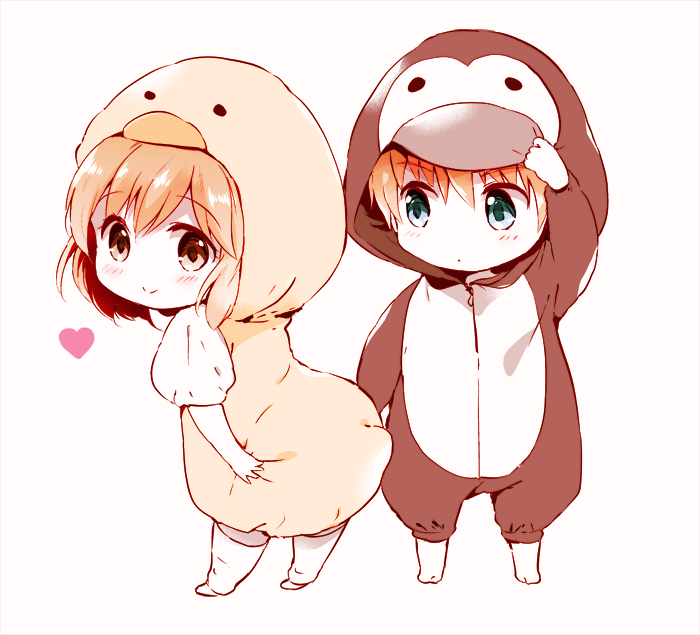 1boy 1girl akina_tsukako arm_up blonde_hair blue_eyes brown_eyes closed_mouth clothes_grab commentary_request deformed djeeta_(granblue_fantasy) duck_costume feather_(granblue_fantasy) granblue_fantasy heart light_blush looking_at_another looking_at_viewer looking_back short_hair simple_background smile standing white_background