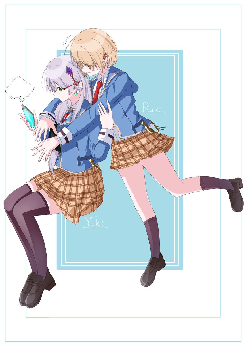 2girls blonde_hair blue_jacket collared_shirt glasses green_eyes grey_hair hair_ornament hair_over_one_eye hair_over_shoulder hairclip heaven_burns_red izumi_yuki jacket kayamori_ruka long_hair low-tied_long_hair match_neco multiple_girls necktie one_eye_covered red_eyes red_necktie round_eyewear school_uniform shirt short_hair white_shirt yuri