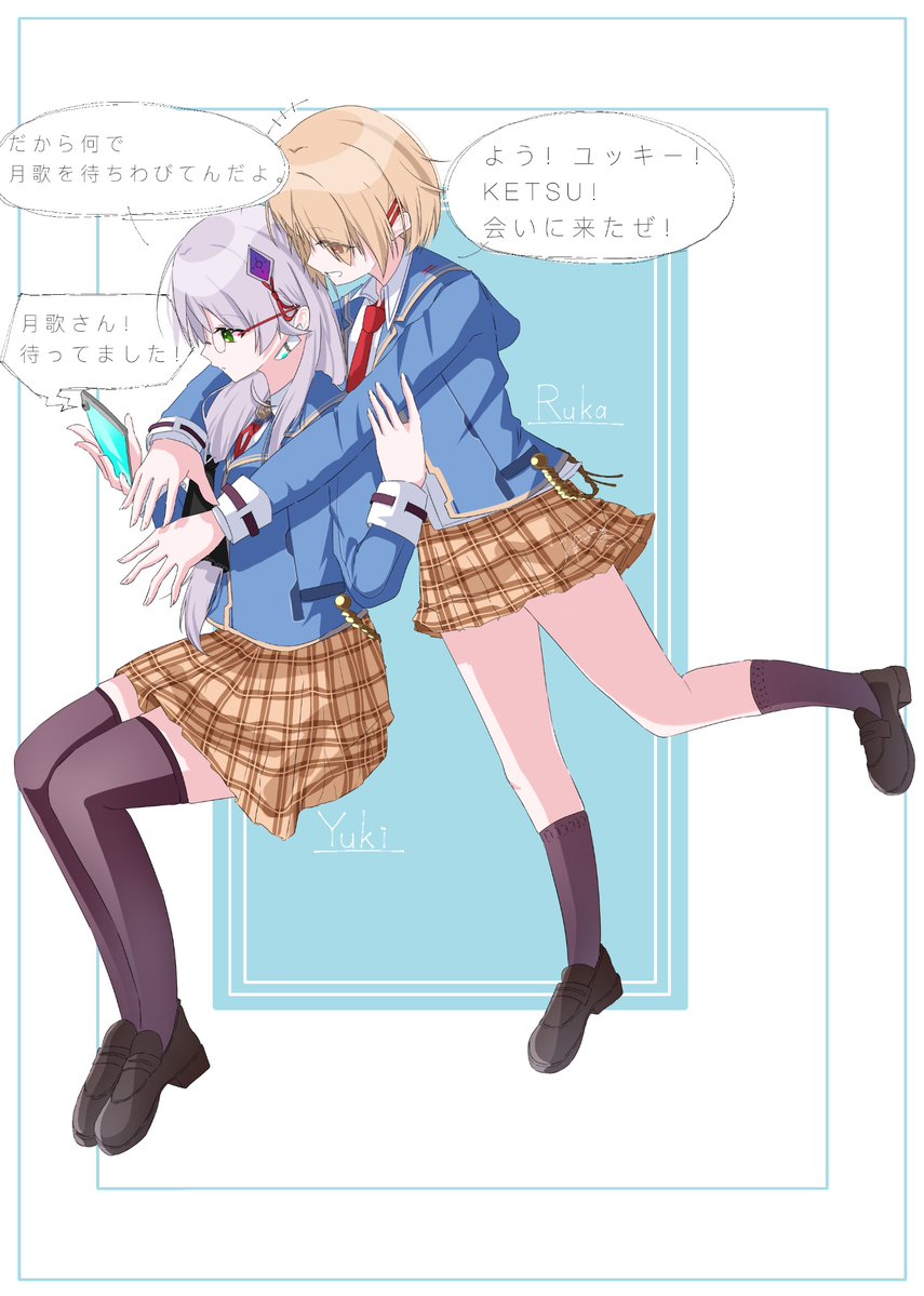 2girls blonde_hair blue_jacket collared_shirt glasses green_eyes grey_hair hair_ornament hair_over_one_eye hair_over_shoulder hairclip heaven_burns_red izumi_yuki jacket kayamori_ruka long_hair low-tied_long_hair match_neco multiple_girls necktie one_eye_covered red_eyes red_necktie round_eyewear school_uniform shirt short_hair speech_bubble white_shirt yuri