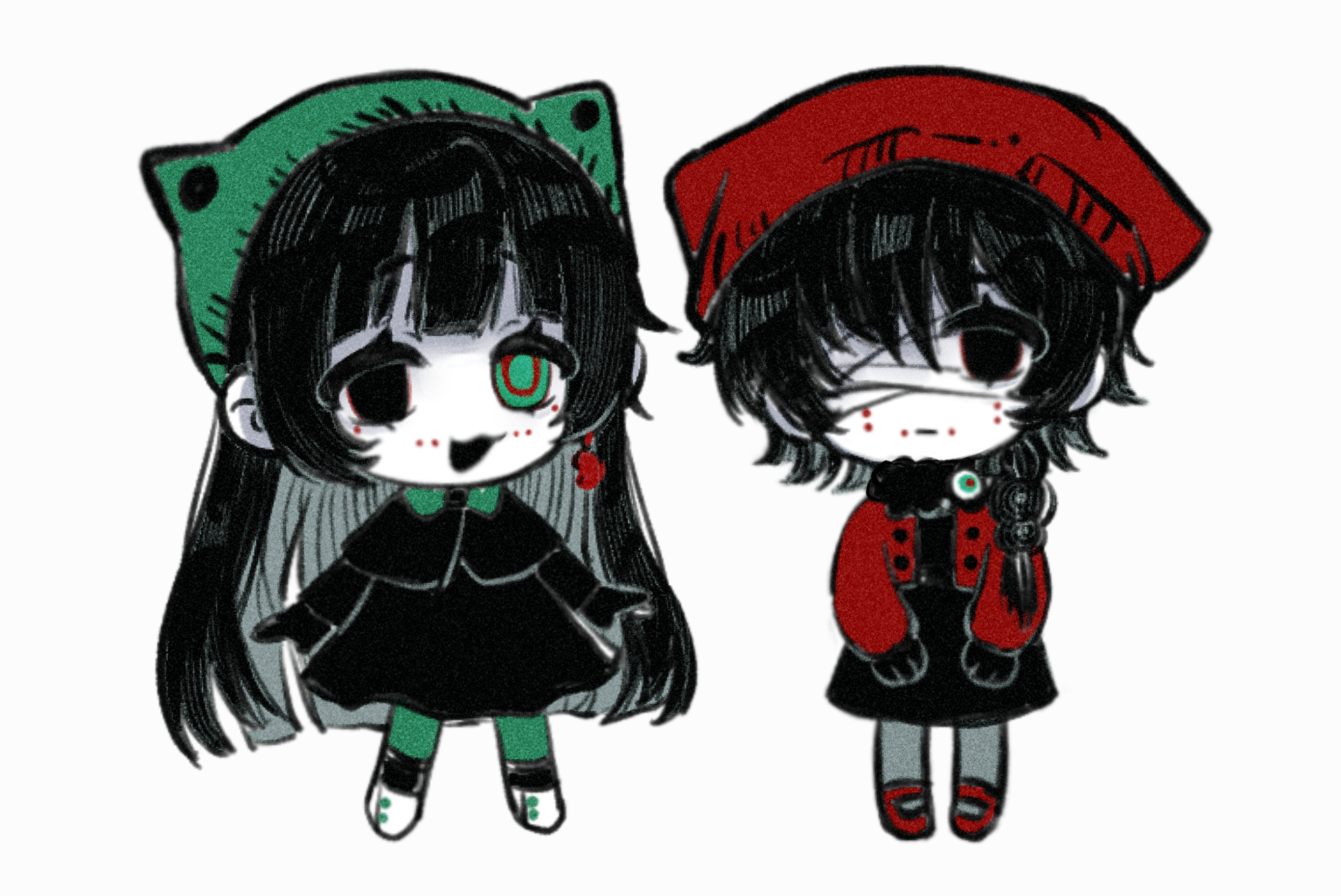 2girls :3 bandage_over_one_eye black_capelet black_dress black_eyes black_gloves black_hair bow bowtie braid capelet chibi chibi_only chinese_commentary closed_mouth colored_skin commentary_request dress facial_mark film_grain gloves green_bow green_bowtie green_eyes green_hat green_pantyhose grey_pantyhose hat heterochromia highres jacket long_hair mark_under_both_eyes mary_janes multiple_girls naihe_(female)_(touqi_guaitan) open_clothes open_jacket pantyhose procreate_(medium) red_jacket red_shoes shoes siblings side_braid simai_lebai simple_background single_braid sisters touqi_guaitan twins white_background white_shoes white_skin wu_song_(female)_(touqi_guaitan)