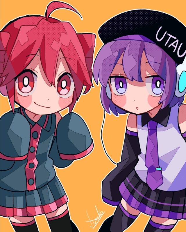 2girls blush_stickers collared_shirt detached_sleeves drill_hair hat kasane_teto kasane_teto_(utau) long_sleeves looking_at_viewer multiple_girls necktie pink_eyes pink_hair pleated_skirt purple_eyes purple_hair robot_ears shirt short_hair skirt sleeveless sleeveless_shirt sleeves_past_fingers sleeves_past_wrists smile thighhighs twin_drills utane_uta utau yellow_background yuusuke-kun