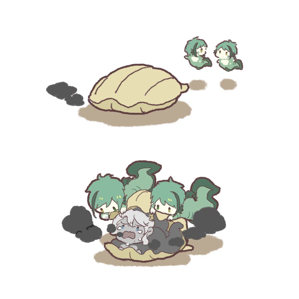3boys azul_ashengrotto azul_ashengrotto_(octopus) brothers chibi clam crying eel_boy fins floyd_leech floyd_leech_(eel) full_body green_hair head_fins ink jade_leech jade_leech_(eel) male_focus monster_boy multiple_boys neod octopus_boy seashell shell short_hair siblings simple_background twins twisted_wonderland white_background