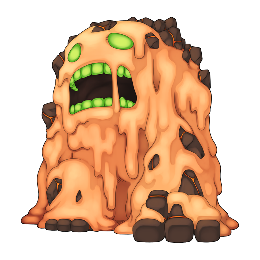 chibi chibi_only full_body golem green_scarf lava lava_golem_(ragnarok_online) looking_afar monster no_humans official_art open_mouth ragnarok_online rock scarf simple_background solo teeth transparent_background yuichirou