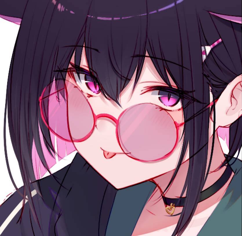 1girl :p animal_ears bespectacled black_choker black_hair black_jacket blue_archive cat_ears cat_girl choker close-up closed_mouth colored_inner_hair extra_ears glasses hair_between_eyes hair_ornament hairclip jacket kazusa_(blue_archive) looking_at_viewer multicolored_hair pink-tinted_eyewear pink_eyes pink_hair red-framed_eyewear round_eyewear short_hair simple_background solo tinted_eyewear tongue tongue_out white_background yata_mawari