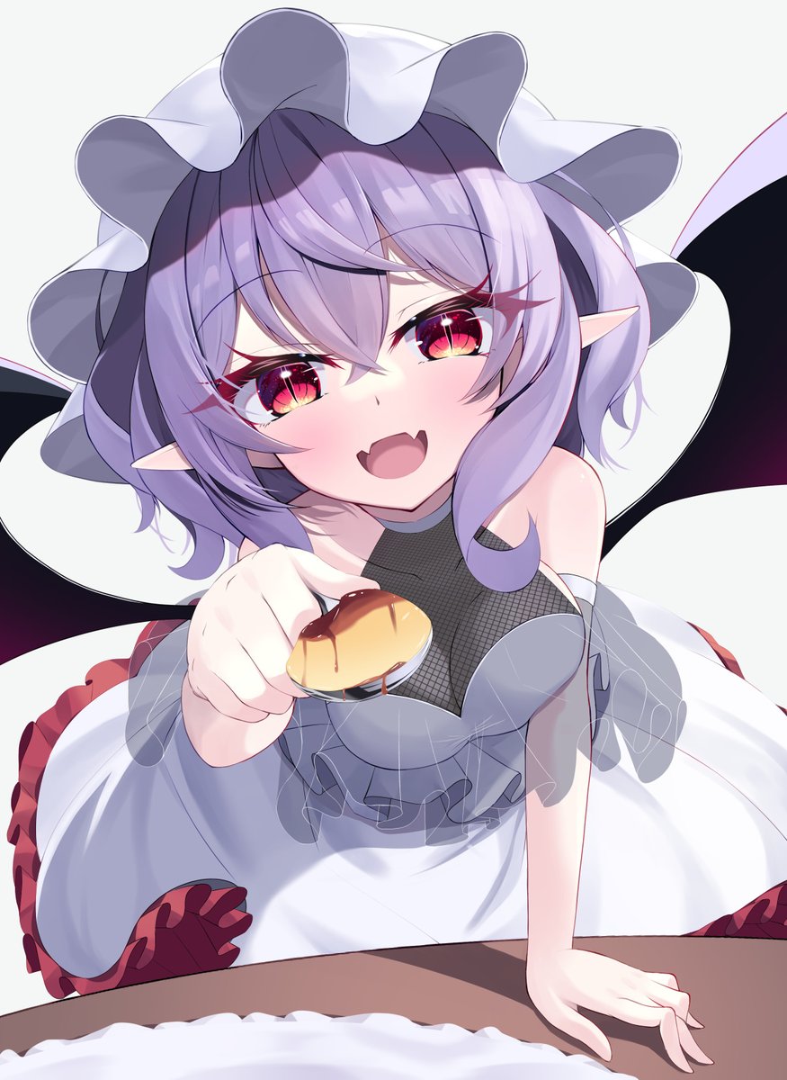 1girl bare_shoulders bat_wings blue_hair breasts commentary_request dress fangs feeding food giving halter_dress halterneck hat highres holding holding_spoon incoming_food looking_at_viewer medium_hair mob_cap open_mouth pointy_ears pov_across_table pudding red_eyes remilia_scarlet s_vileblood see-through_clothes simple_background skin_fangs smile solo spoon table touhou wings