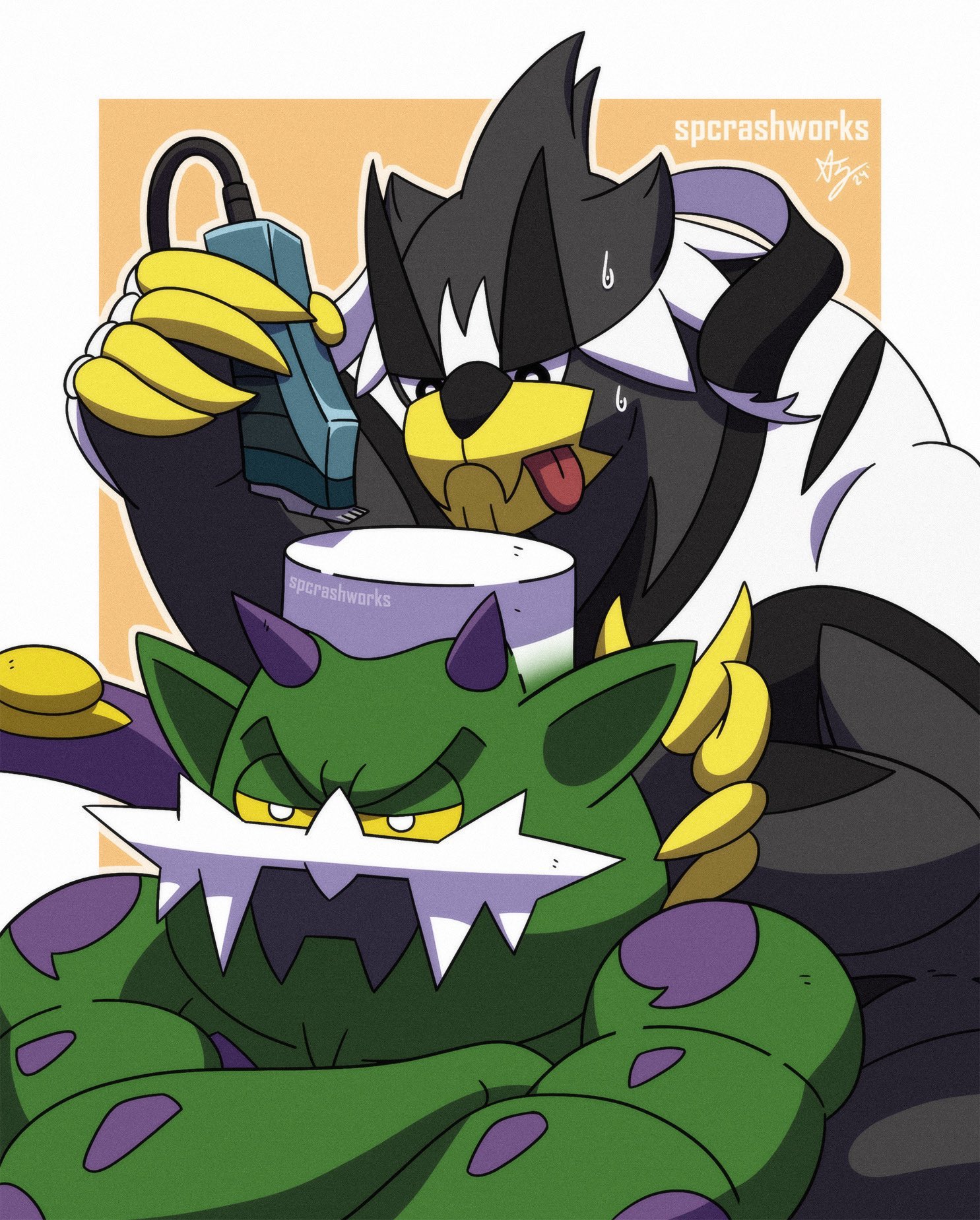 2024 2boys artist_name black_fur claws concentrating crossed_arms cutting_hair fangs gen_5_pokemon gen_8_pokemon grabbing_from_behind highres legendary_pokemon multiple_boys muscular nintendo no_humans pectorals pokemon pokemon_(creature) simple_background spcrashworks standing supreme_(brand) sweat tongue tongue_out tornadus tornadus_(incarnate) urshifu urshifu_(rapid)