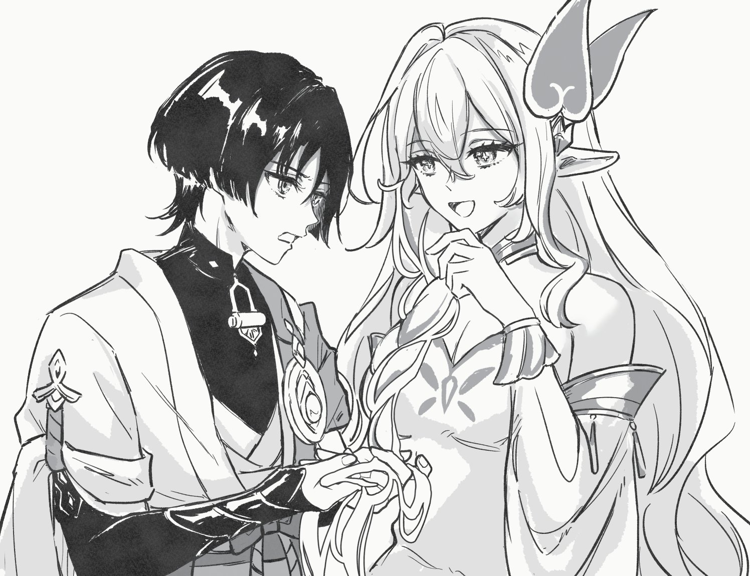 1boy 1girl aged_up armlet armor bare_shoulders blunt_ends bodysuit bow braid breasts bridal_gauntlets cape choker cleavage detached_sleeves double-parted_bangs dress genshin_impact hair_between_eyes hair_ornament hand_on_own_chin hetero holding_another's_hair japanese_armor japanese_clothes jewelry kimono knme00 kote kurokote leaf leaf_hair_ornament long_hair looking_at_another monochrome nahida_(genshin_impact) neck open_clothes open_kimono open_mouth pointy_ears rope scaramouche_(genshin_impact) short_sleeves side_braid sidelocks single_braid vision_(genshin_impact) wanderer_(genshin_impact)