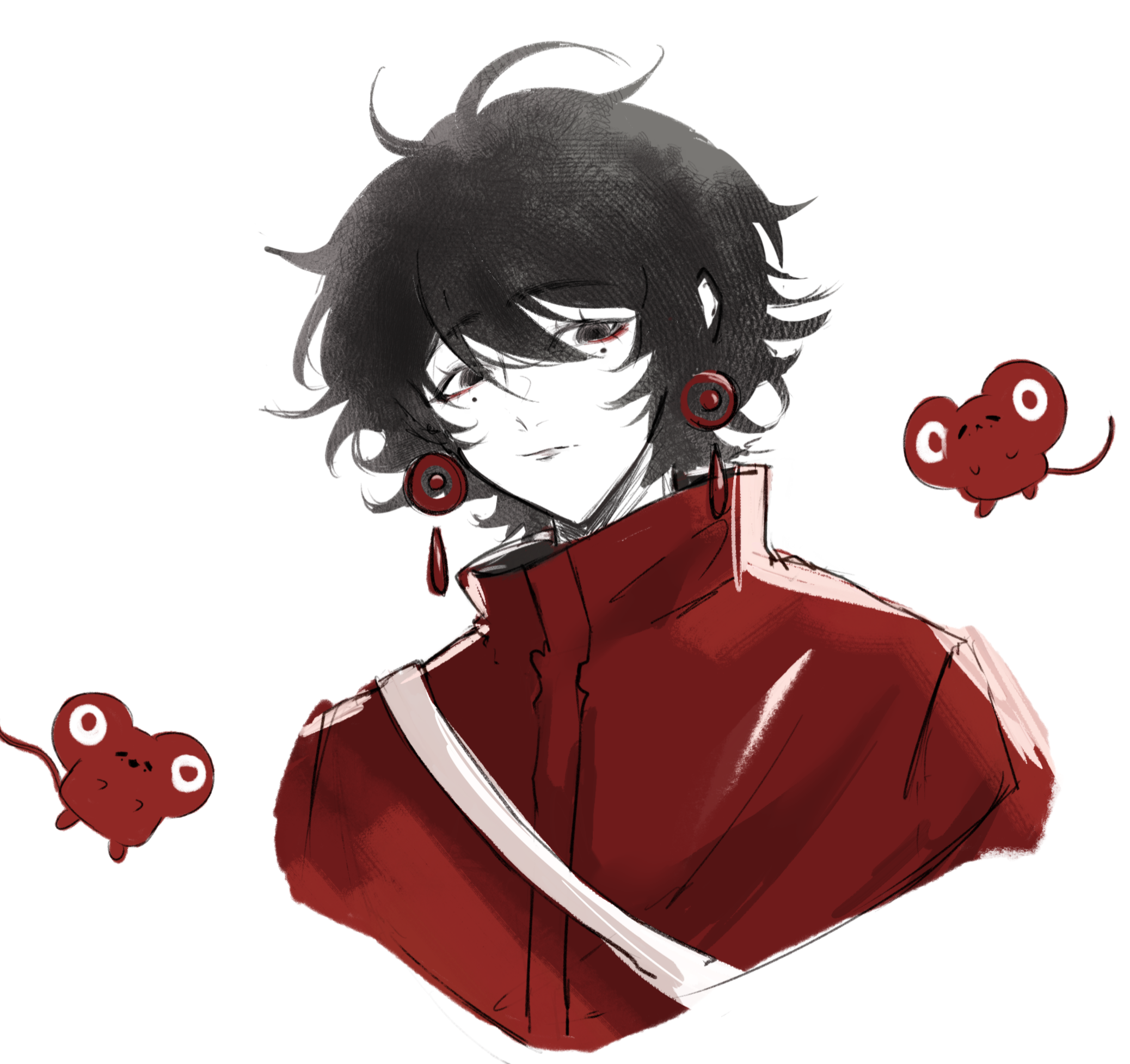 1boy animalization black_eyes black_hair chinese_commentary closed_mouth commentary_request earrings hair_between_eyes high_collar highres jacket jewelry labyrinth26718 li_yuting_(male) male_focus mole mole_under_each_eye mole_under_eye mouse_(animal) multiple_moles portrait red_jacket short_hair simple_background touqi_guaitan white_background