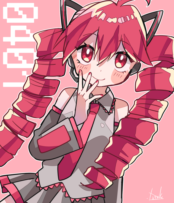 1girl ahoge alternate_hairstyle cosplay detached_sleeves drill_hair hair_ornament hand_up hatsune_miku hatsune_miku_(cosplay) kasane_teto long_hair long_sleeves looking_at_viewer nail_polish necktie pink_background pink_eyes pink_hair pleated_skirt shirt skirt sleeveless sleeveless_shirt smile solo twin_drills utau very_long_hair vocaloid yuusuke-kun