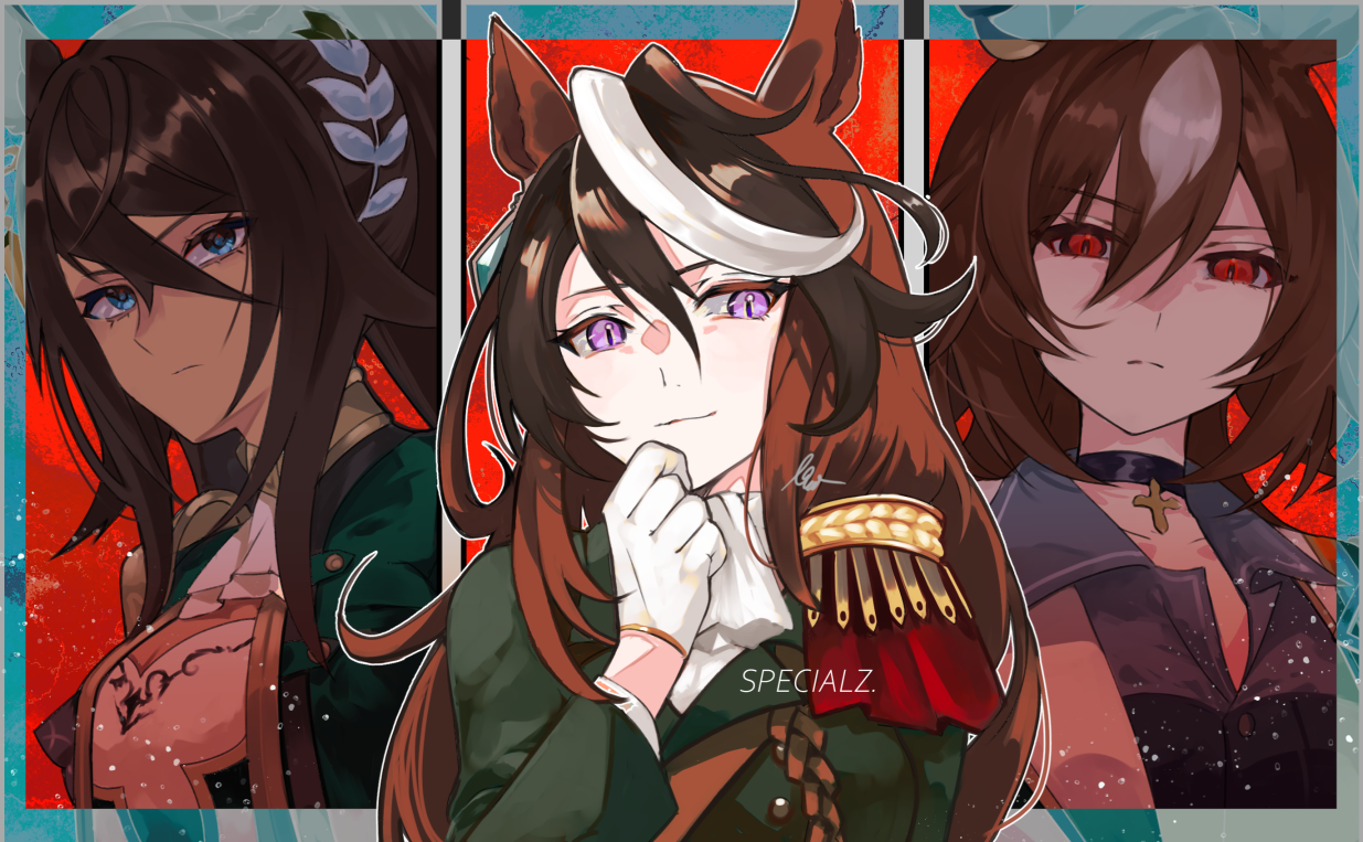 3girls aiguillette animal_ears ascot black_hair blue_eyes breasts brown_hair closed_mouth commentary_request dark-skinned_female dark_skin earrings epaulettes gloves green_jacket hair_between_eyes horse_ears horse_girl jacket jewelry long_hair long_sleeves looking_at_viewer madori_(sayuri5) multicolored_hair multiple_girls purple_eyes red_eyes shirt sirius_symboli_(umamusume) smile streaked_hair symboli_kris_s_(umamusume) symboli_rudolf_(umamusume) two-tone_hair umamusume uniform upper_body white_ascot white_gloves white_hair