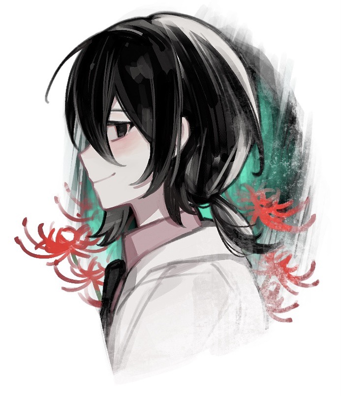 1boy black_eyes black_hair black_necktie chinese_commentary closed_mouth collared_shirt commentary_request cropped_shoulders flower from_side jacket male_focus medium_hair mo_chengwei muzhifeiliu necktie open_clothes open_jacket pink_shirt profile red_flower shirt smile solo spider_lily touqi_guaitan white_jacket