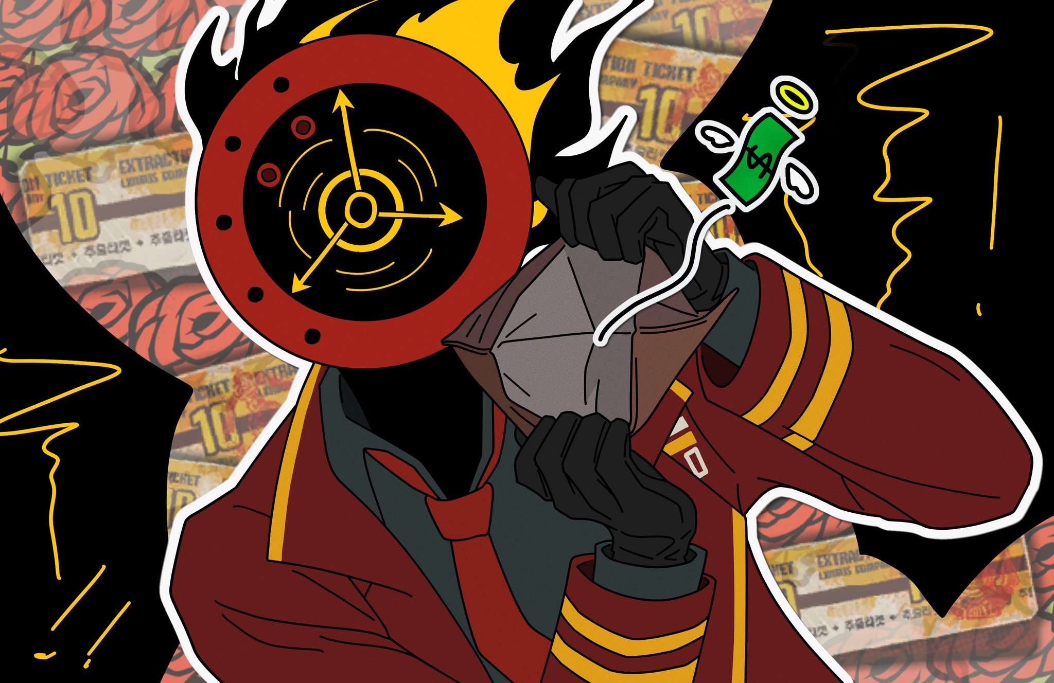 1other banknote black_gloves black_shirt black_skin clock coat coconut_2611 collared_shirt colored_skin dante_(limbus_company) dollar_bill facing_viewer fire gloves halo highres holding holding_wallet limbus_company lunacy_(limbus_company) money necktie object_head photo-referenced project_moon red_coat red_necktie shirt solo upper_body wallet wings