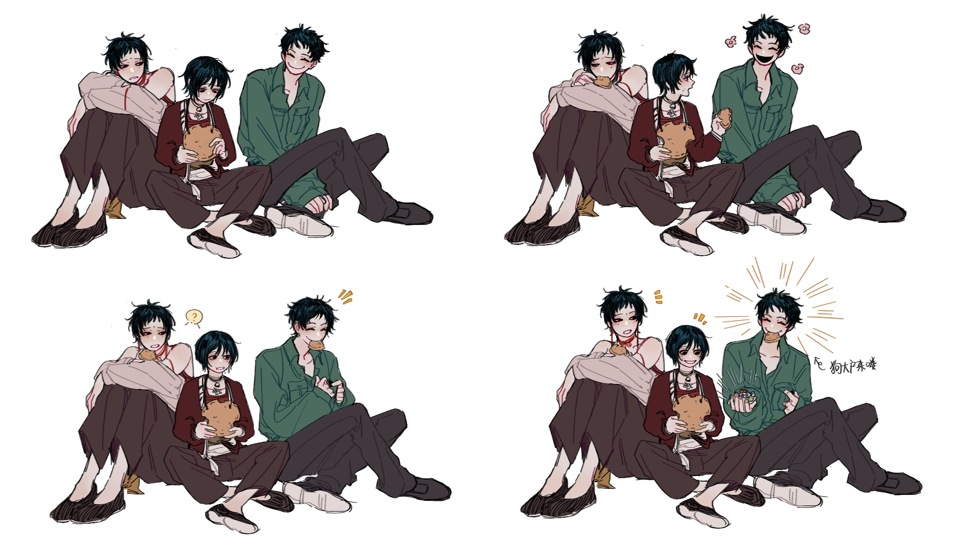 3boys ? ^_^ black_eyes black_hair black_pants black_shoes chinese_commentary chinese_text closed_eyes closed_mouth collared_shirt commentary_request food_in_mouth green_shirt happy_aura highres jacket liu_jingping long_sleeves male_focus multiple_boys nibadan notice_lines open_clothes open_jacket open_mouth pants red_jacket red_shirt shirt shoes short_hair shou_qianhui sitting smile spoken_question_mark touqi_guaitan translation_request wang_xincheng
