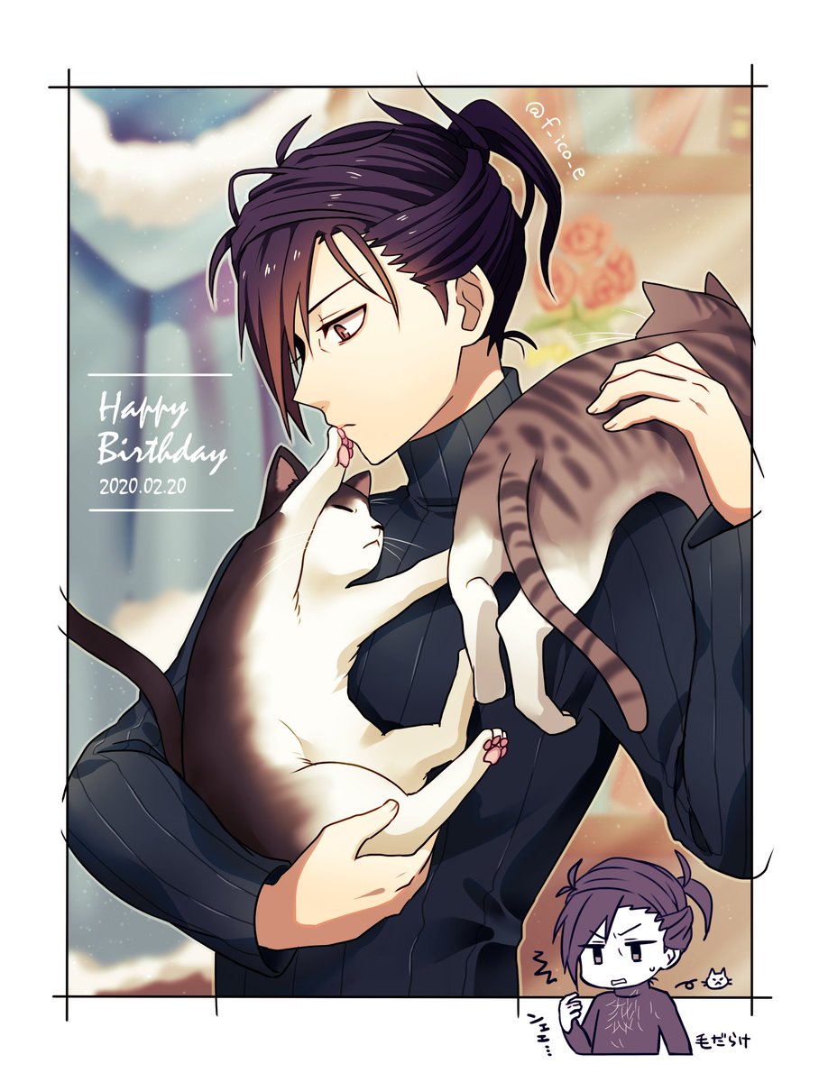 1boy animal animal_on_shoulder aqua_cape black_hair black_sweater blurry blurry_background border cape cat cat_on_shoulder closed_mouth commentary dated doodle_inset english_text f_ico_e felix_hugo_fraldarius fire_emblem fire_emblem:_three_houses flower fur-trimmed_cape fur-trimmed_hood fur_trim hair_over_one_eye hand_up happy_birthday highres holding holding_animal holding_cat hood long_sleeves male_focus multicolored_cat multiple_cats nintendo notice_lines orange_eyes paw_up ponytail red_flower shelf short_ponytail solo sweater tabby_cat turtleneck twitter_username unworn_clothes upper_body white_border white_fur