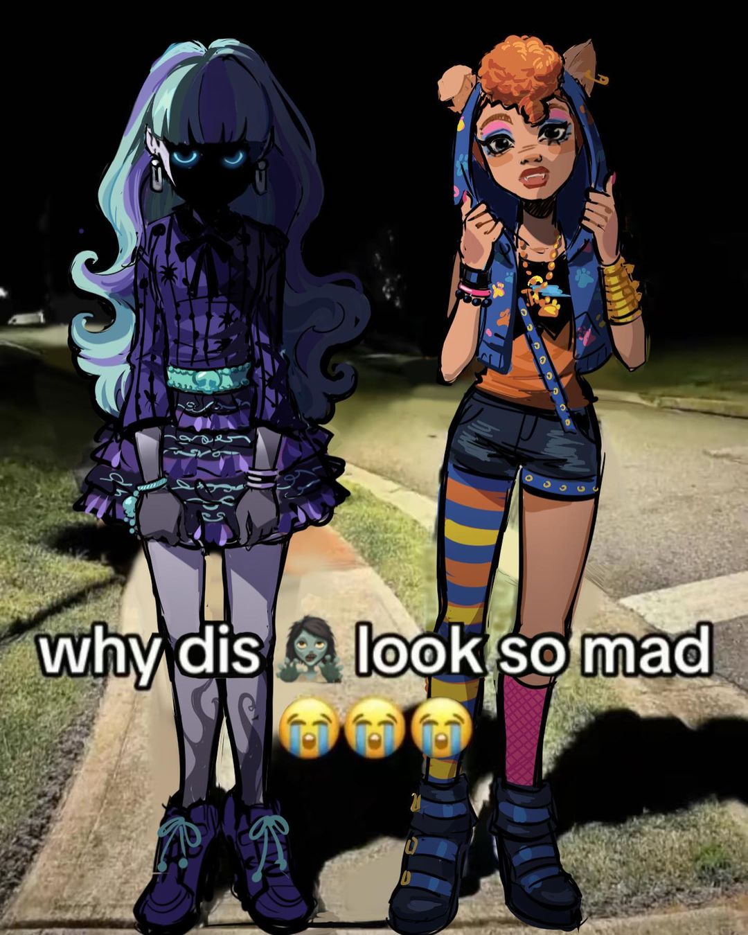2girls animal_ear_fluff animal_ears animal_print armband black_armband black_bow black_eyes black_footwear black_shorts blue_hoodie blue_sclera bow bracelet chain claws colored_sclera colored_skin curly_hair earrings english_text fangs fishnets glow-in-the-dark glowing glowing_eyes gold_bracelet gold_chain gold_necklace highres hood hoodie horizontal-striped_thighhighs howleen_wolf jewelry layered_skirt long_hair long_sleeves looking_at_viewer meme mistyxxart monster_girl monster_high monster_high_(g1) multicolored_hair multicolored_thighhighs multiple_girls necklace night open_clothes open_hoodie open_mouth orange_hair paw_print paw_print_pattern photo-referenced photo_background pink_nails pink_socks purple_footwear purple_hair purple_shirt purple_skin purple_skirt shaded_face shirt short_shorts shorts single_thighhigh skirt sleeveless sleeveless_hoodie sleeveless_shirt socks spider_print standing striped_clothes striped_thighhighs thighhighs two-tone_shirt twyla_boogeyman werewolf why_dis_ninja_look_so_mad_(meme) wolf_ears wolf_girl