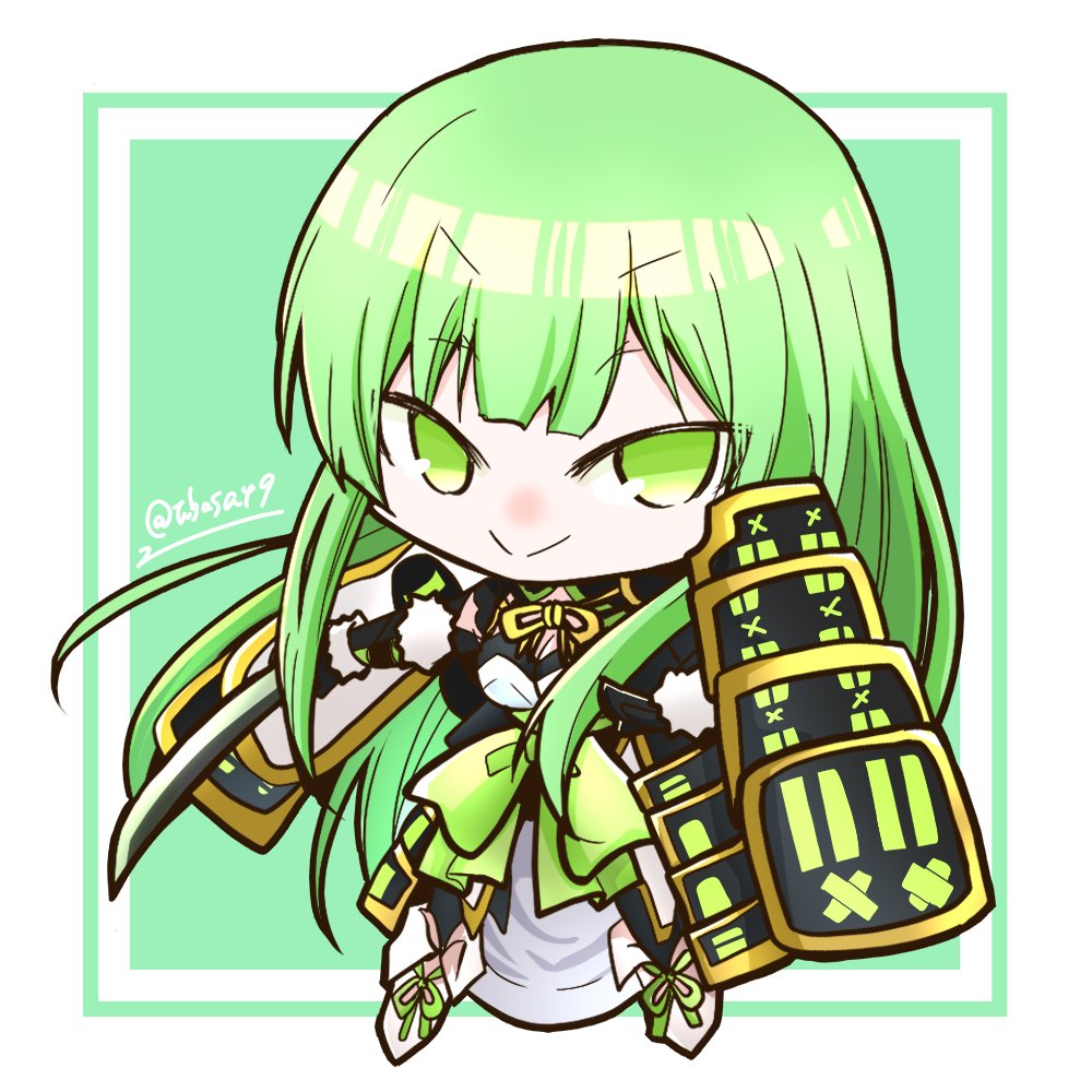 1girl :> armor armored_skirt chibi commentary dress full_body green_background green_eyes green_hair green_sash hizamaru_(tenka_hyakken) holding holding_sword holding_weapon japanese_armor long_hair outside_border sash shoulder_armor sidelocks sode solo sword tachi_(weapon) tenka_hyakken tubasa49 twitter_username weapon white_footwear