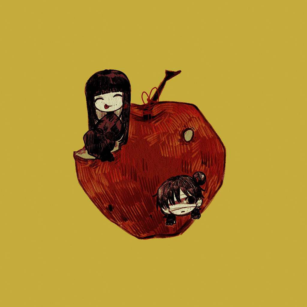 2girls ^_^ apple bandage_over_one_eye black_dress black_gloves black_hair chibi chibi_only closed_eyes closed_mouth colored_skin commentary dress food fruit gloves hair_rings long_hair long_sleeves mini_person minigirl multiple_girls muluo_cantu naihe_(female)_(touqi_guaitan) official_art simple_background single_hair_ring sitting untranslatable_commentary tongue tongue_out touqi_guaitan white_skin wu_song_(female)_(touqi_guaitan) yellow_background
