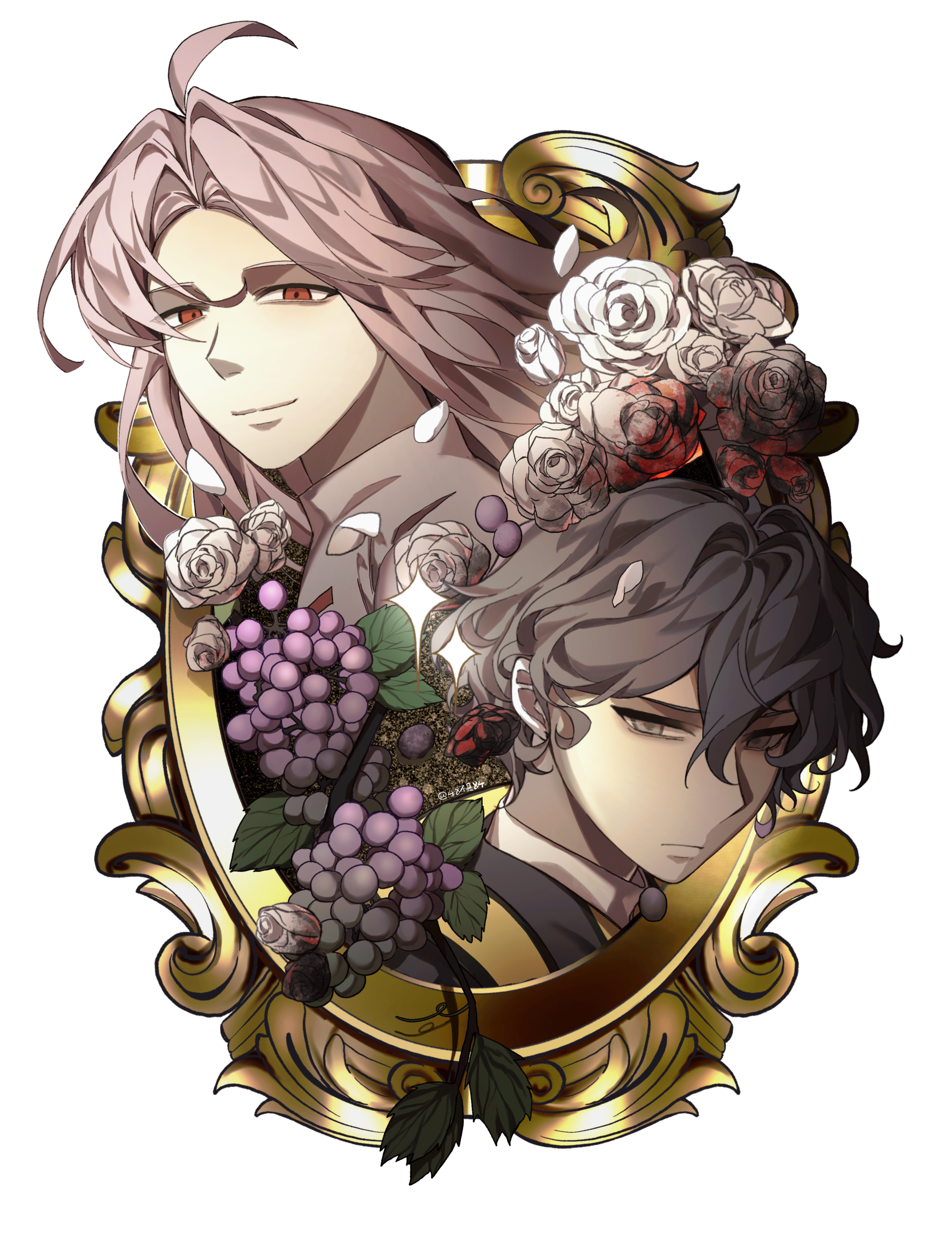 2boys absurdres ahoge black_hair black_jacket chinese_commentary chunaizhanshi23057 closed_mouth commentary_request flower food fruit grapes grey_hair hair_between_eyes hatsutori_hajime highres jacket long_hair male_focus multiple_boys parted_bangs pink_hair red_eyes rose saibou_shinkyoku shirt short_hair smile utsugi_noriyuki white_flower white_rose white_shirt