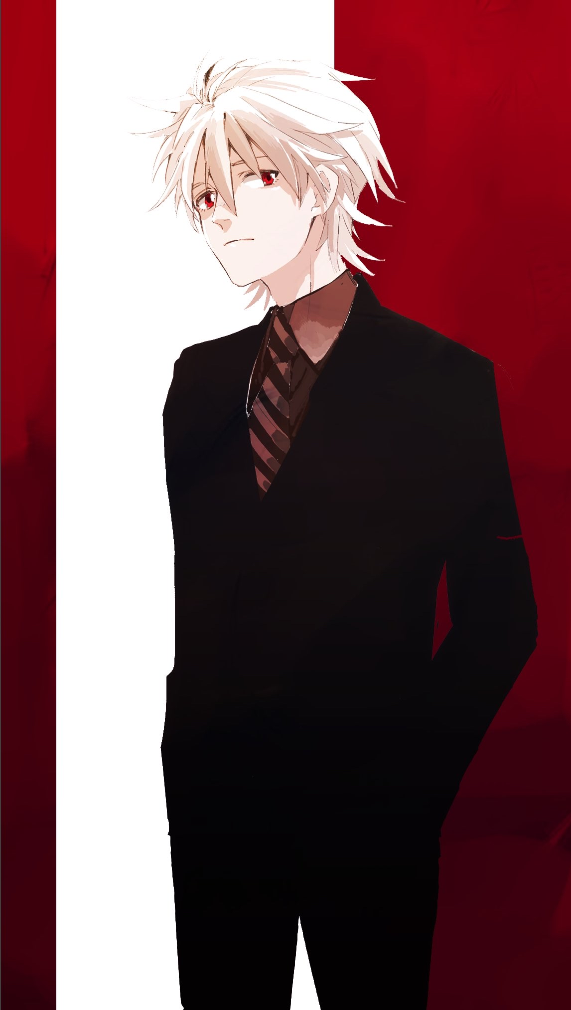 1boy anglo_(ida020202) formal_clothes hands_in_pockets highres long_sleeves looking_at_viewer male_focus nagisa_kaworu necktie neon_genesis_evangelion pants red_eyes short_hair simple_background solo standing white_hair
