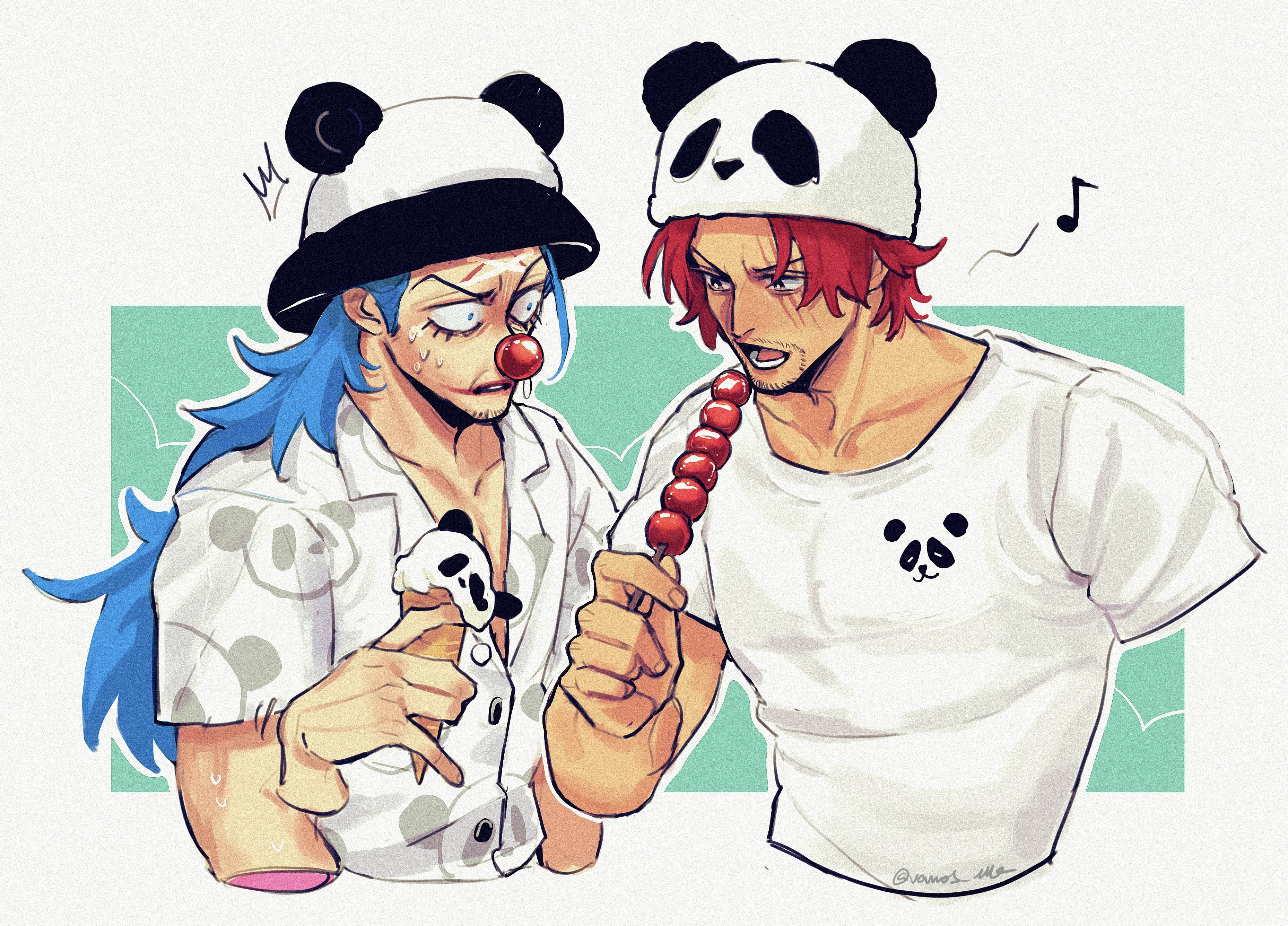 2boys ^^^ absurdres animal-themed_food animal_ears animal_print bear_print beard_stubble blue_eyes blue_hair broad_shoulders brown_eyes buggy_the_clown clown_nose collarbone collared_shirt cropped_arm cropped_torso disembodied_hand eyelashes facial_hair food goatee_stubble highres holding holding_food ice_cream_cone long_hair male_focus melting multiple_boys musical_note one_piece panda_ears panda_hat panda_print partially_unbuttoned red_hair red_nose scar scar_across_eye scar_on_face shanks_(one_piece) shirt short_hair short_sleeves signature spoken_musical_note stubble surprised vamos_mk white_shirt
