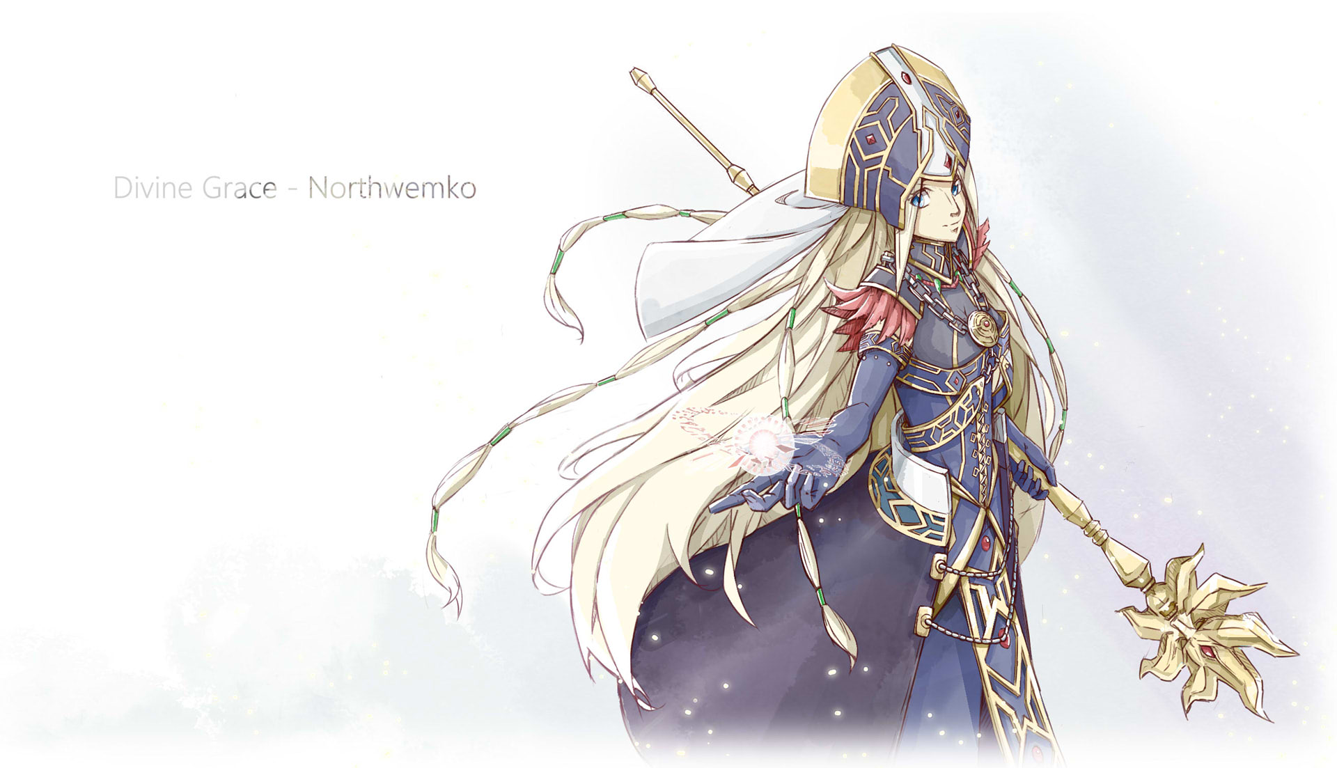 1girl blonde_hair blue_dress blue_eyes blue_gloves blue_hat character_name closed_mouth cowboy_shot divine_grace_-_northwemko dress duel_monster elbow_gloves feather-trimmed_sleeves from_side gloves gold_trim hair_ribbon hat highres holding holding_staff jewelry light_particles long_hair looking_at_viewer looking_to_the_side mitre multi-tied_hair object_floating_above_hand orb outstretched_arm pendant ribbon short_sleeves simple_background smile solo staff tamago_(xyxk3743) tress_ribbon turtleneck veil very_long_hair waist_cape white_background white_veil yu-gi-oh!