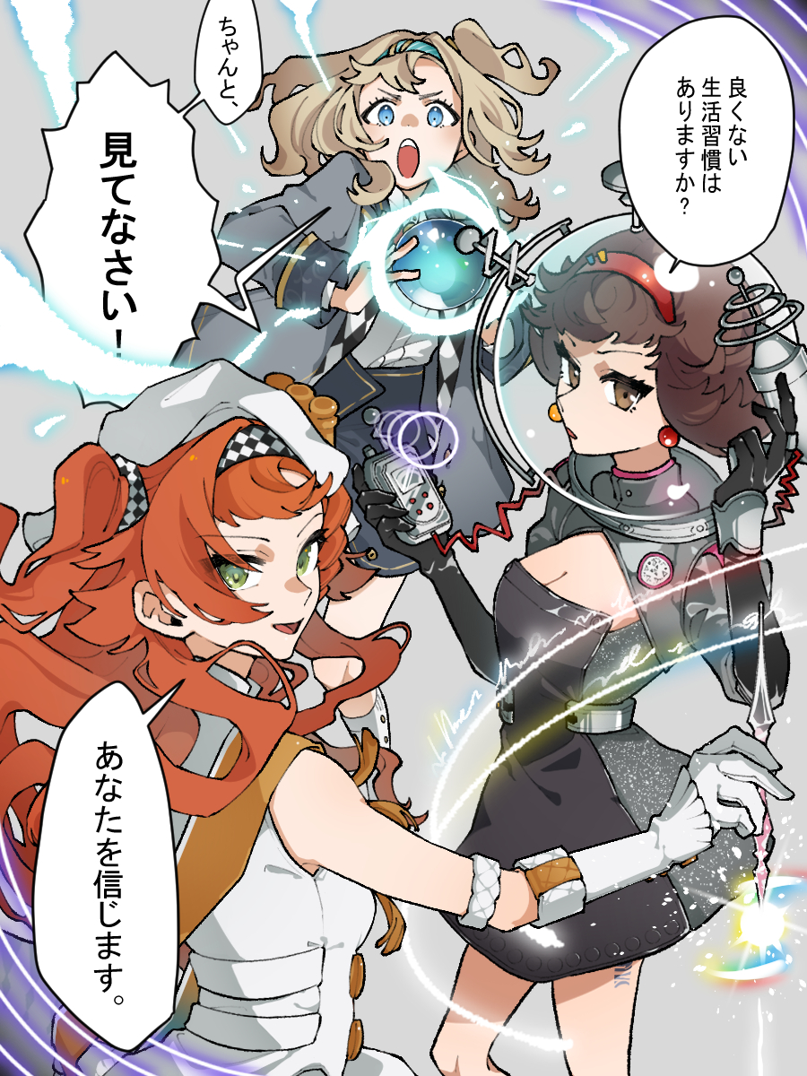 3girls :d :o ball bare_shoulders beret black_gloves blazer blue_eyes blue_hairband breasts brown_eyes brown_hair cleavage cleavage_cutout clothing_cutout cowboy_shot crystal_ball device dress earrings energy glass_pen gloves green_eyes grey_background grey_dress grey_hair grey_jacket grey_skirt gun hairband handgun hands_up hat helmet highres holding holding_ball holding_gun holding_pen holding_weapon jacket jewelry kaeru_(uj26cobrsv) long_hair long_sleeves looking_at_viewer magic matilda_bouanich medium_hair mesmer_jr. multiple_girls one_side_up open_mouth orange_hair pen red_hairband reverse:1999 sash shirt short_dress short_hair shoulder_sash skirt sleeveless sleeveless_dress smile sonetto_(parade_anthem)_(reverse:1999) sonetto_(reverse:1999) speech_bubble tank_helmet translated two_side_up v-shaped_eyebrows weapon white_dress white_gloves white_hat white_shirt yellow_sash