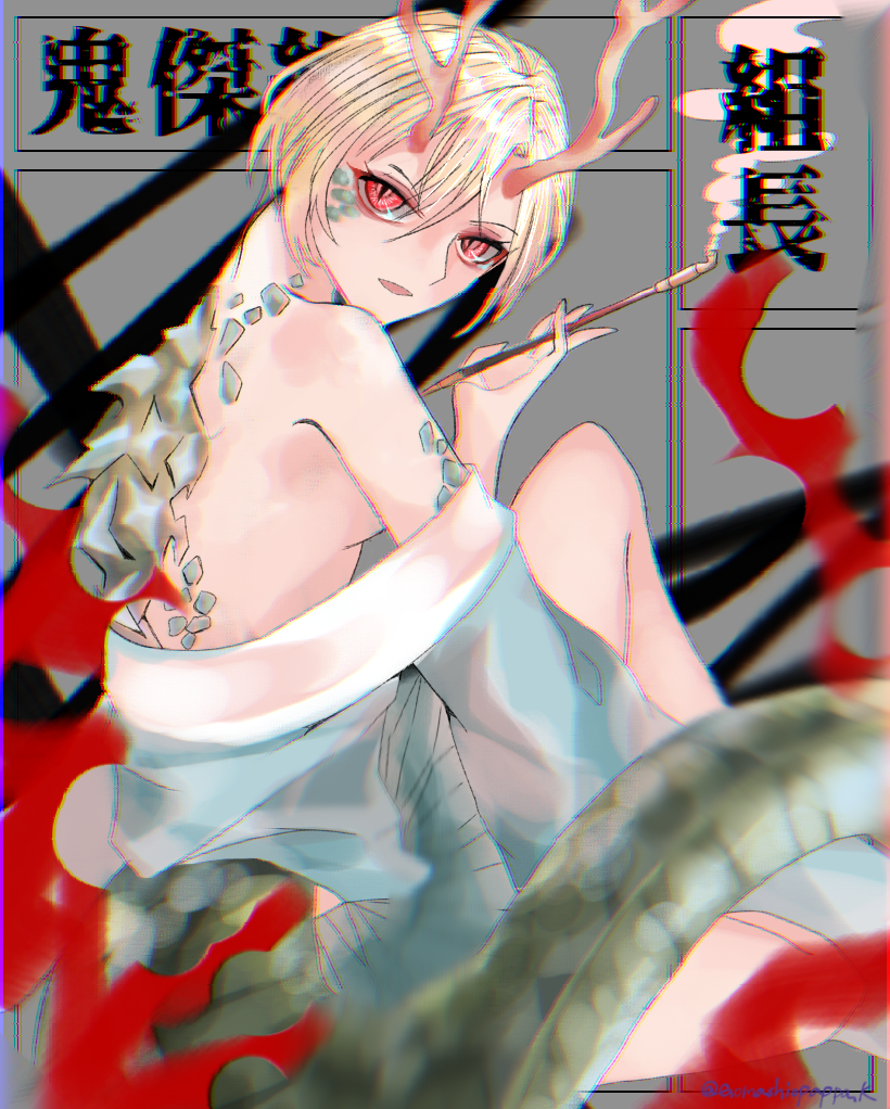 1girl antlers blonde_hair dragon_girl dragon_horns dragon_tail fur-tipped_tail gomashiopappa_k green_scales green_tail holding holding_smoking_pipe horns kicchou_yachie looking_at_viewer monster_girl open_mouth red_eyes scales short_hair slit_pupils smoke smoking smoking_pipe solo tail touhou yellow_horns