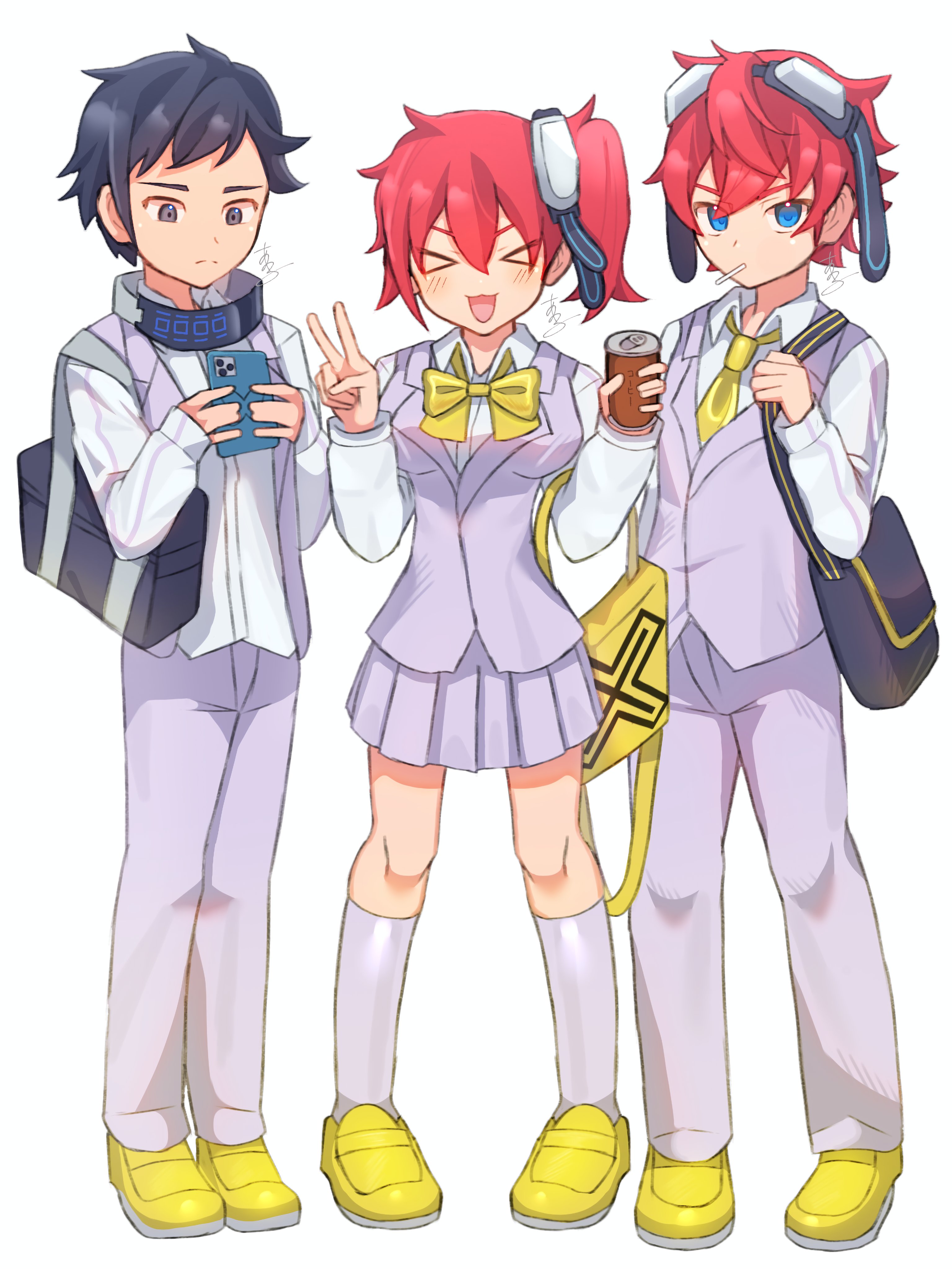 >_< 1girl 2boys absurdres aiba_ami aiba_takumi amasawa_keisuke black_hair blue_eyes bow bowtie can digimon digimon_story:_cyber_sleuth digimon_story:_cyber_sleuth_-_hacker's_memory full_body goggles goggles_on_head grey_pants grey_skirt grey_vest highres holding holding_can medium_hair multiple_boys necktie pants pleated_skirt red_hair sasaki_(ssk8083) shirt short_hair side_ponytail simple_background skirt v vest white_background white_shirt yellow_bow yellow_bowtie yellow_necktie