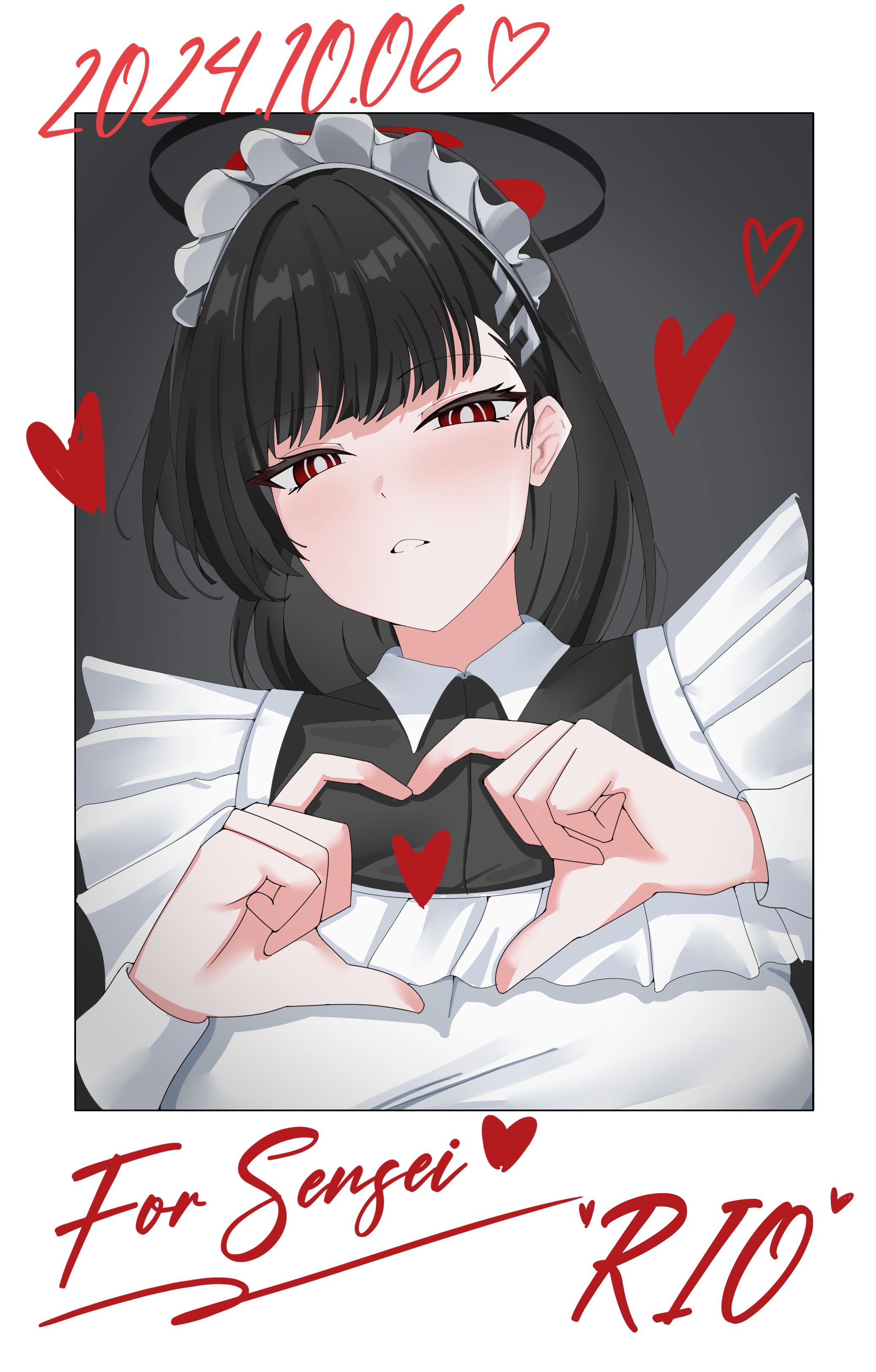 1girl absurdres alternate_costume apron black_hair blue_archive breasts english_text enmaided hair_ornament hairclip halo heart heart_hands highres lengkuass long_hair looking_at_viewer maid maid_apron maid_headdress parted_lips portrait red_eyes ringed_eyes rio_(blue_archive) solo