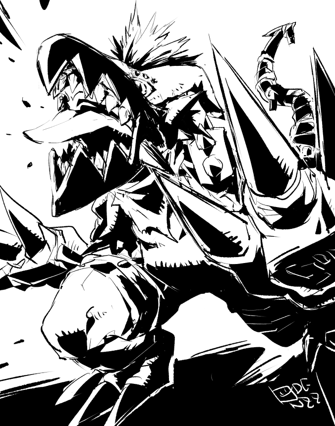 artist_name bandana bandana_around_neck brass_knuckles digimon digimon_(creature) dragon full_body mohawk monochrome oden_(odenzzi) punkmon sharp_teeth shoulder_spikes spikes teeth vest weapon