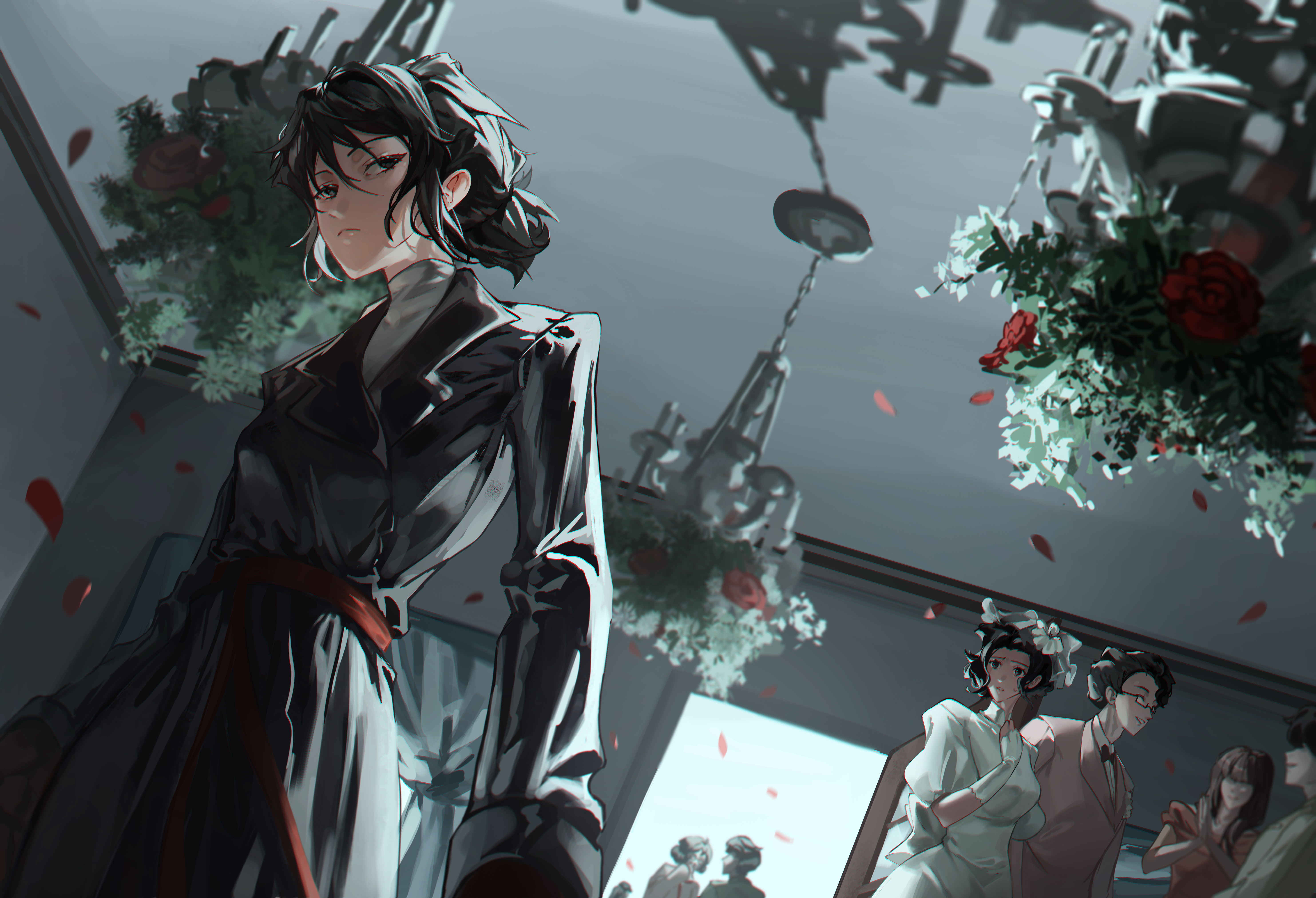 1boy 2girls absurdres black_coat black_eyes black_hair bridal_veil chandelier choi_dajeong coat commentary dan_myeonghoon dress english_commentary falling_petals flower formal_clothes from_below gloves go_boksu highres livelyeko long_sleeves married_in_red multiple_girls petals pink_suit ponytail red_flower red_petals red_rose rose shirt short_sleeves suit turtleneck veil wedding_dress white_dress white_gloves white_shirt white_veil