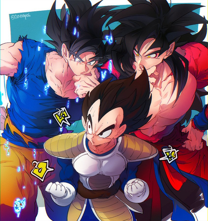 black_hair blue_eyes blue_sash dougi dragon_ball dragon_ball_heroes dragon_ball_super gloves grey_eyes long_hair monkey_boy monkey_tail multiple_boys muscular muscular_male ommmyoh open_mouth pants red_fur saiyan sash son_goku son_goku_(xeno) spiked_hair super_saiyan super_saiyan_4 tail time_patrol_(dragon_ball) twitter_username ultra_instinct vegeta yellow_eyes