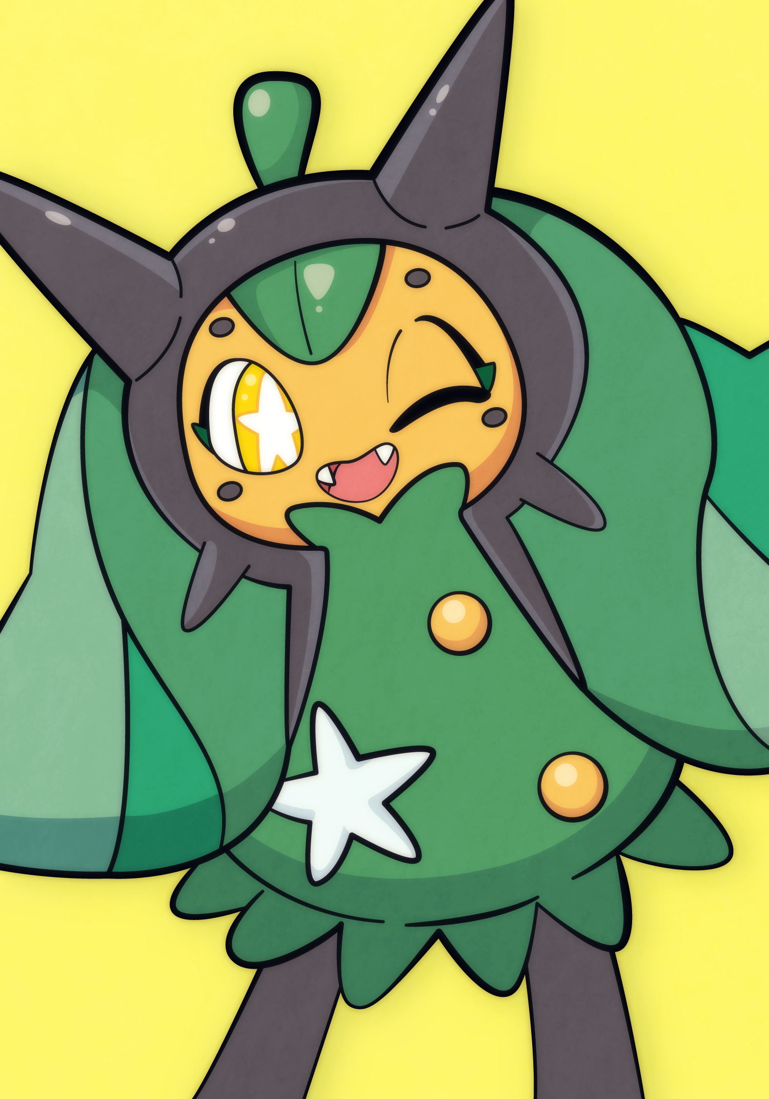 1girl ;d commentary_request fangs gen_9_pokemon green_background happy highres koroni_(nkrgs) looking_at_viewer nintendo ogerpon one_eye_closed open_mouth pokemon pokemon_(creature) smile solo star-shaped_pupils star_(symbol) symbol-shaped_pupils yellow_eyes
