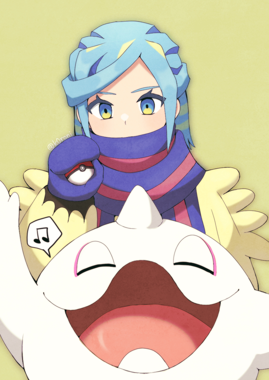 1boy aqua_eyes aqua_hair cetoddle commentary_request eyelashes grusha_(pokemon) hand_up highres holding holding_poke_ball jacket koroni_(nkrgs) long_sleeves male_focus mittens musical_note nintendo poke_ball poke_ball_(basic) pokemon pokemon_(creature) pokemon_scarlet_and_violet scarf scarf_over_mouth spoken_musical_note striped_clothes striped_scarf yellow_jacket