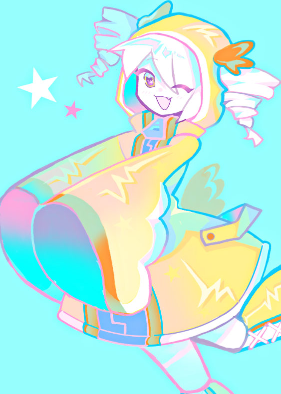 1234blue_ray 1girl blue_background colored_skin cowboy_shot drill_hair ducky_(phighting!) head_wings looking_at_viewer one_eye_closed phighting! raincoat roblox simple_background solo star_(symbol) twin_drills white_hair white_skin wings yellow_raincoat