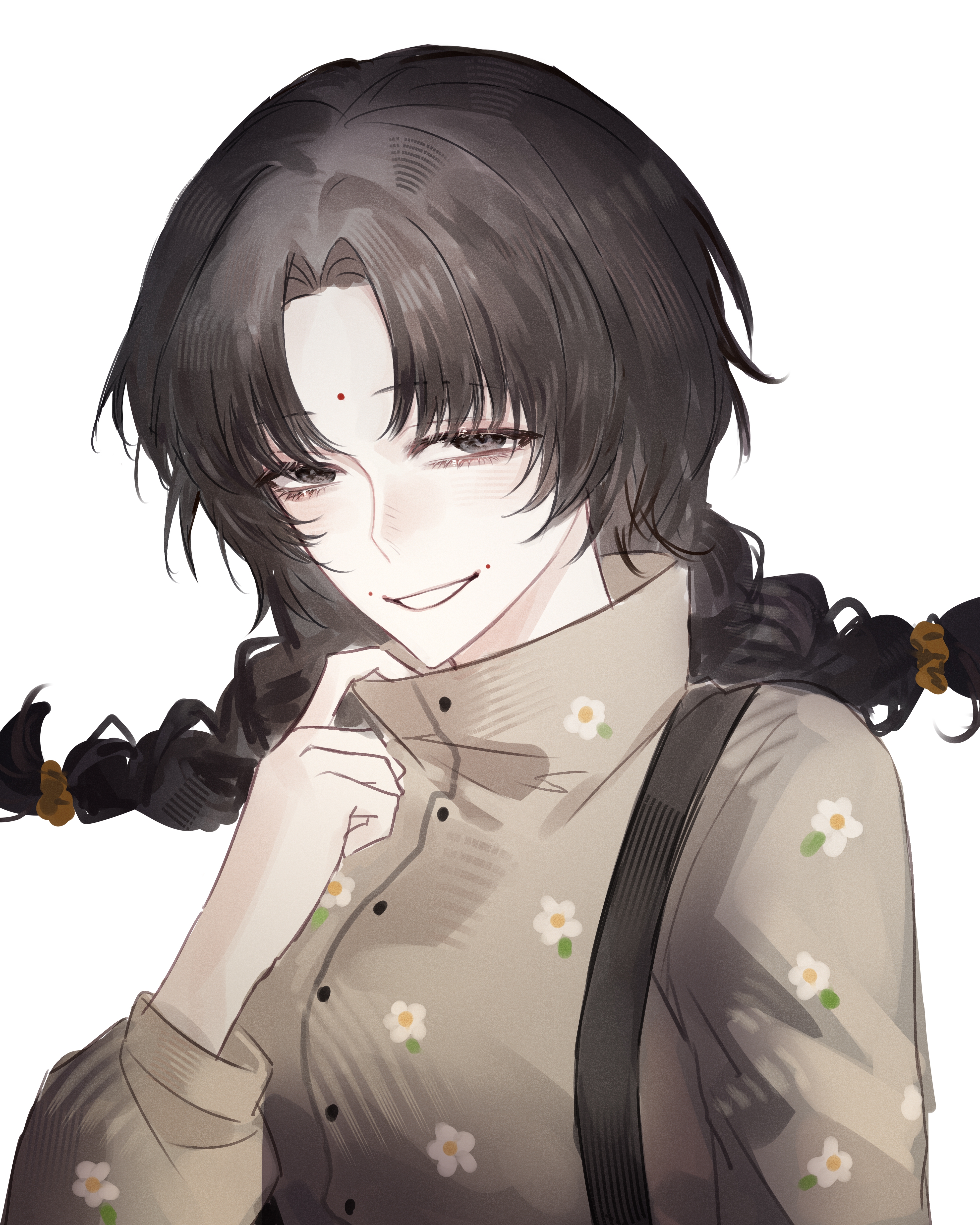 1girl absurdres black_eyes black_hair braid brown_shirt chinese_commentary commentary_request facial_mark floral_print forehead_mark highres kc-rk_sl long_sleeves parted_bangs portrait print_shirt shirt simple_background smile solo touqi_guaitan twin_braids white_background wu_jiahui