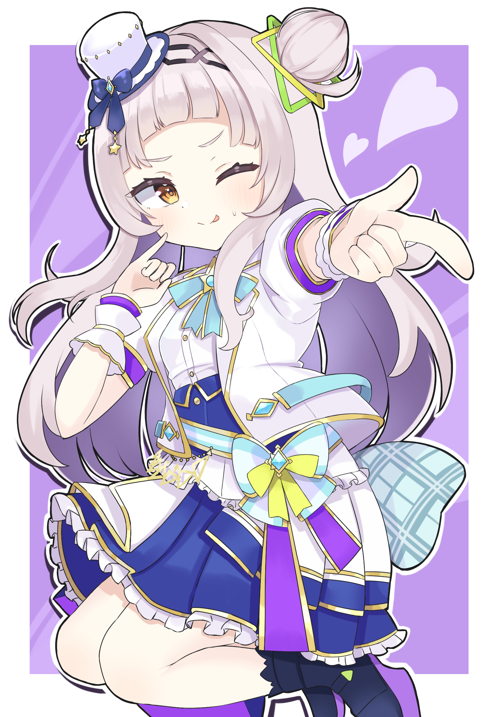 1girl :p blue_bow blue_bowtie blue_skirt blush bow bowtie brown_eyes commentary_request frilled_skirt frills grey_hair hair_bun hat highres hololive hololive_idol_uniform_(bright) ichipon1515 jacket long_hair looking_at_viewer mini_hat murasaki_shion official_alternate_costume one_eye_closed pinky_out pointing purple_background skirt solo tongue tongue_out two-tone_background virtual_youtuber white_background white_hat white_jacket wrist_cuffs