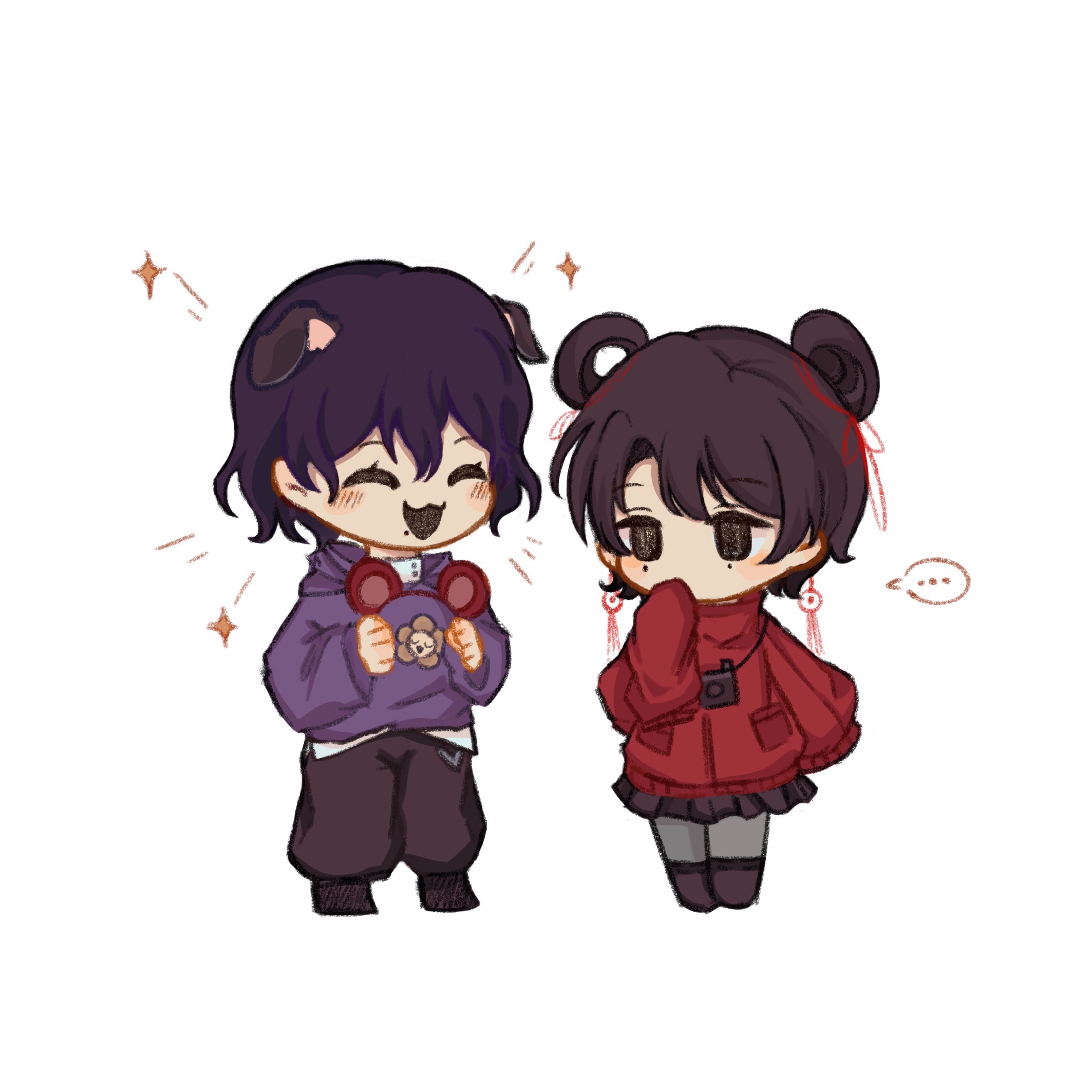 ... 1boy 1girl :3 animal_ear_hairband animal_ears black_eyes black_hair black_pants black_shoes black_skirt camera camera_around_neck chibi chibi_only chinese_commentary closed_eyes commentary_request dog_ears earrings fake_animal_ears grey_pantyhose hair_between_eyes hair_bun hair_ribbon hair_rings hairband high_collar highres holding_hairband hood hood_down hoodie jacket jewelry li_yuting_(female) long_sleeves male_focus miniskirt mole mole_under_each_eye mole_under_eye mole_under_mouth multiple_moles open_mouth pants pantyhose pleated_skirt purple_hoodie red_jacket red_ribbon ribbon shirt shoes short_hair simple_background single_hair_bun single_hair_ring skirt sleeves_past_fingers sleeves_past_wrists smile sparkle spoken_ellipsis touqi_guaitan white_background white_shirt yalinsuan you_jiujiu