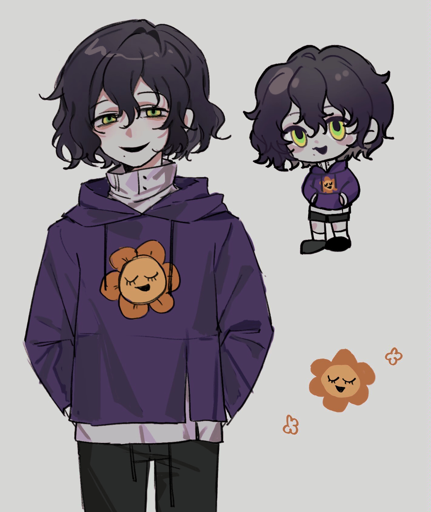 1boy arms_behind_back black_hair black_shoes black_shorts chibi chinese_commentary commentary_request cowboy_shot grey_background hair_between_eyes high_collar highres hood hood_down hoodie long_sleeves male_focus mole mole_under_mouth multicolored_eyes multiple_views open_mouth purple_hoodie qijilan shirt shoes short_hair shorts simple_background smile socks touqi_guaitan white_shirt white_socks you_jiujiu