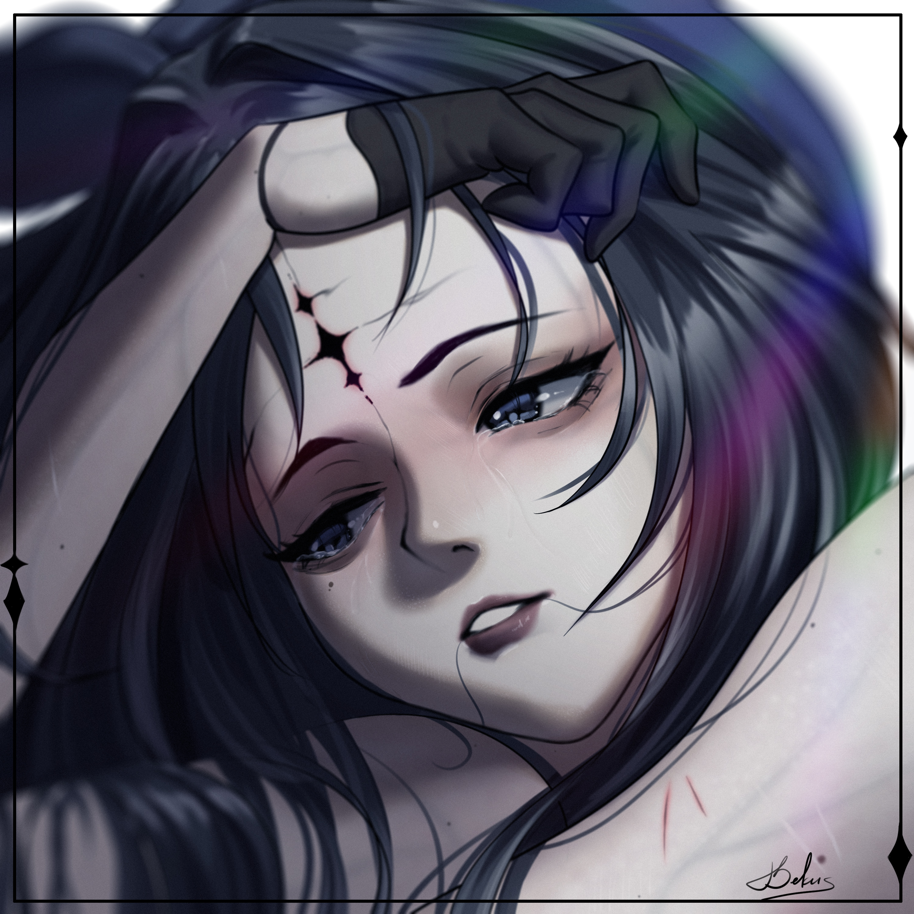 1girl absurdres bekus beret black_eyes black_gloves black_hair blue_hat commentary crying crying_with_eyes_open english_commentary gloves hair_in_own_mouth hand_on_forehead hat highres long_hair looking_to_the_side parted_lips portrait signature solo tacet_mark_(wuthering_waves) tears veins wuthering_waves yangyang_(wuthering_waves)