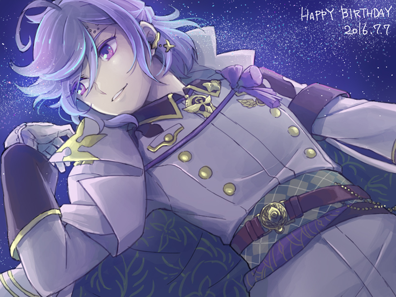 1121japa 1boy ahoge armband badge bakumatsu_rock belt belt_buckle blue_cape bob_cut brown_belt buckle buttons cape collared_jacket double-breasted earclip earrings gloves green_sash half_updo hand_up happy_birthday jacket jewelry looking_to_the_side lying male_focus military_uniform obi obiage okita_souji_(bakumatsu_rock) on_back parted_lips patterned_clothing purple_eyes purple_hair sash sky sleeve_cuffs smile solo star_(sky) starry_sky swept_bangs tassel two-sided_cape two-sided_fabric upper_body wavy_hair white_cape white_gloves white_jacket