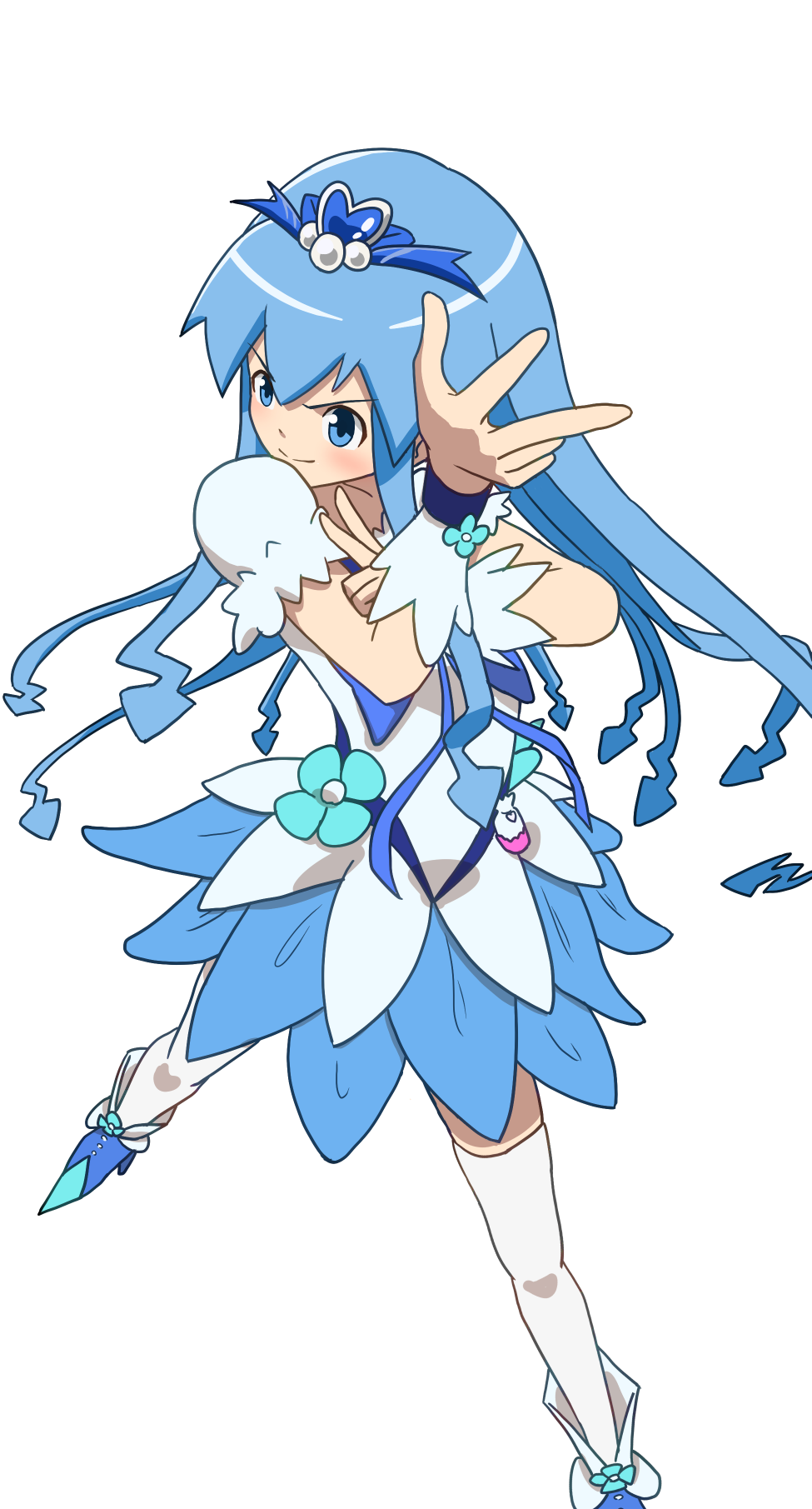 1girl arms_up blue_boots blue_choker blue_dress blue_eyes blue_hair blue_skirt blue_wrist_cuffs blush boots bottle bow bowtie brooch choker closed_mouth cosplay crossed_arms cure_marine cure_marine_(cosplay) dress dress_flower enotsumuri flower flower_skirt from_above hair_ornament heart heart_brooch heart_hair_ornament heartcatch_precure! highres ikamusume index_fingers_raised jewelry long_hair look-alike looking_ahead magical_girl multicolored_skirt perfume_bottle pouch precure puffy_short_sleeves puffy_sleeves ribbon shinryaku!_ikamusume short_dress short_sleeves simple_background skirt smile solo tentacle_hair tentacles thighhighs two-tone_dress v-shaped_eyebrows white_background white_dress white_thighhighs wrist_cuffs