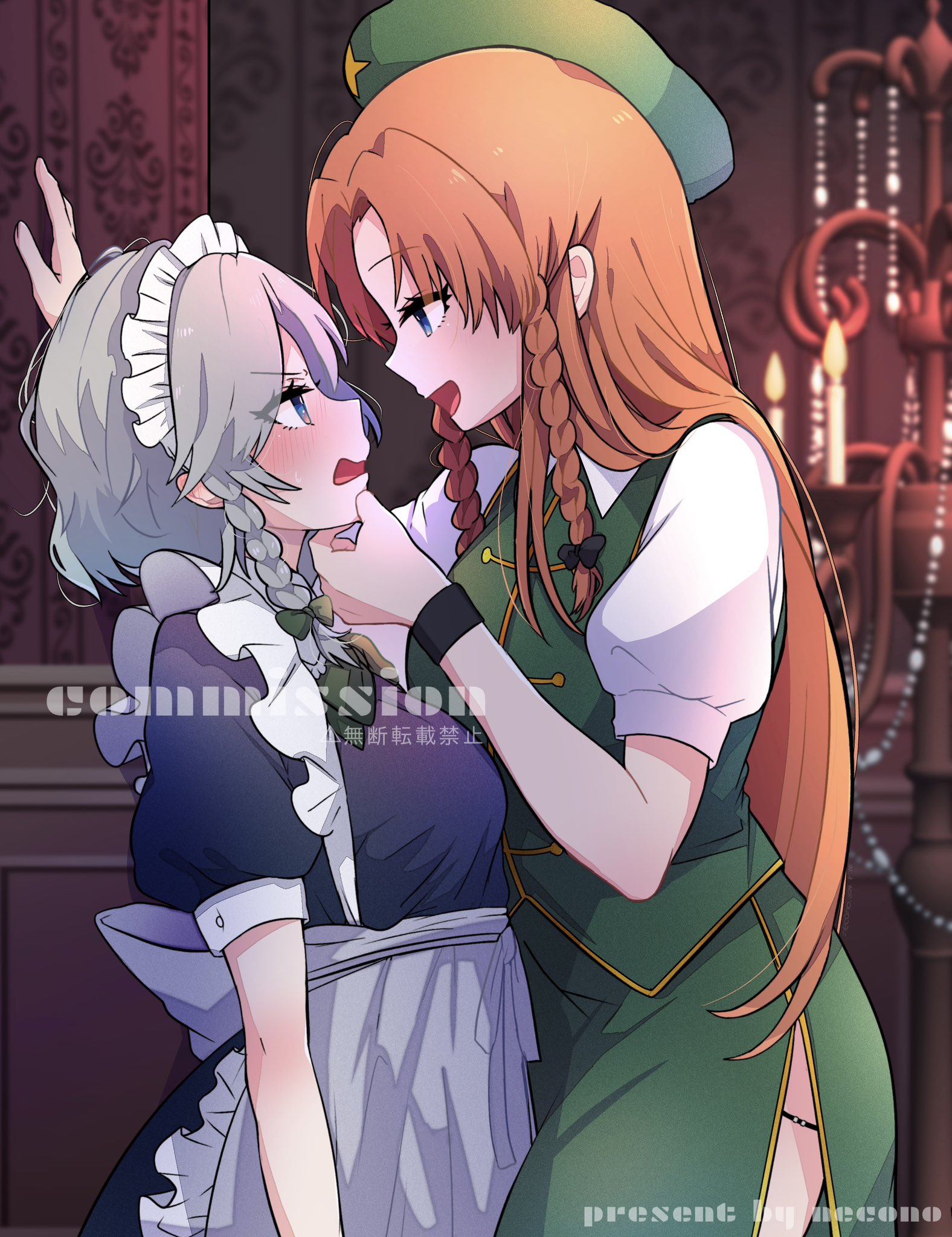 2girls apron beret black_bow blue_dress blue_eyes blush bow braid candle candlestand collared_shirt commentary_request commission dress eye_contact green_bow green_hat green_skirt green_vest grey_hair hair_bow hand_on_another's_chin hat hat_ornament highres hong_meiling izayoi_sakuya long_hair looking_at_another maid_headdress medium_hair multiple_girls necono_(nyu6poko) open_mouth orange_hair puffy_short_sleeves puffy_sleeves shirt short_sleeves side_slit skirt star_(symbol) star_hat_ornament touhou twin_braids vest waist_apron watermark white_apron white_shirt yuri