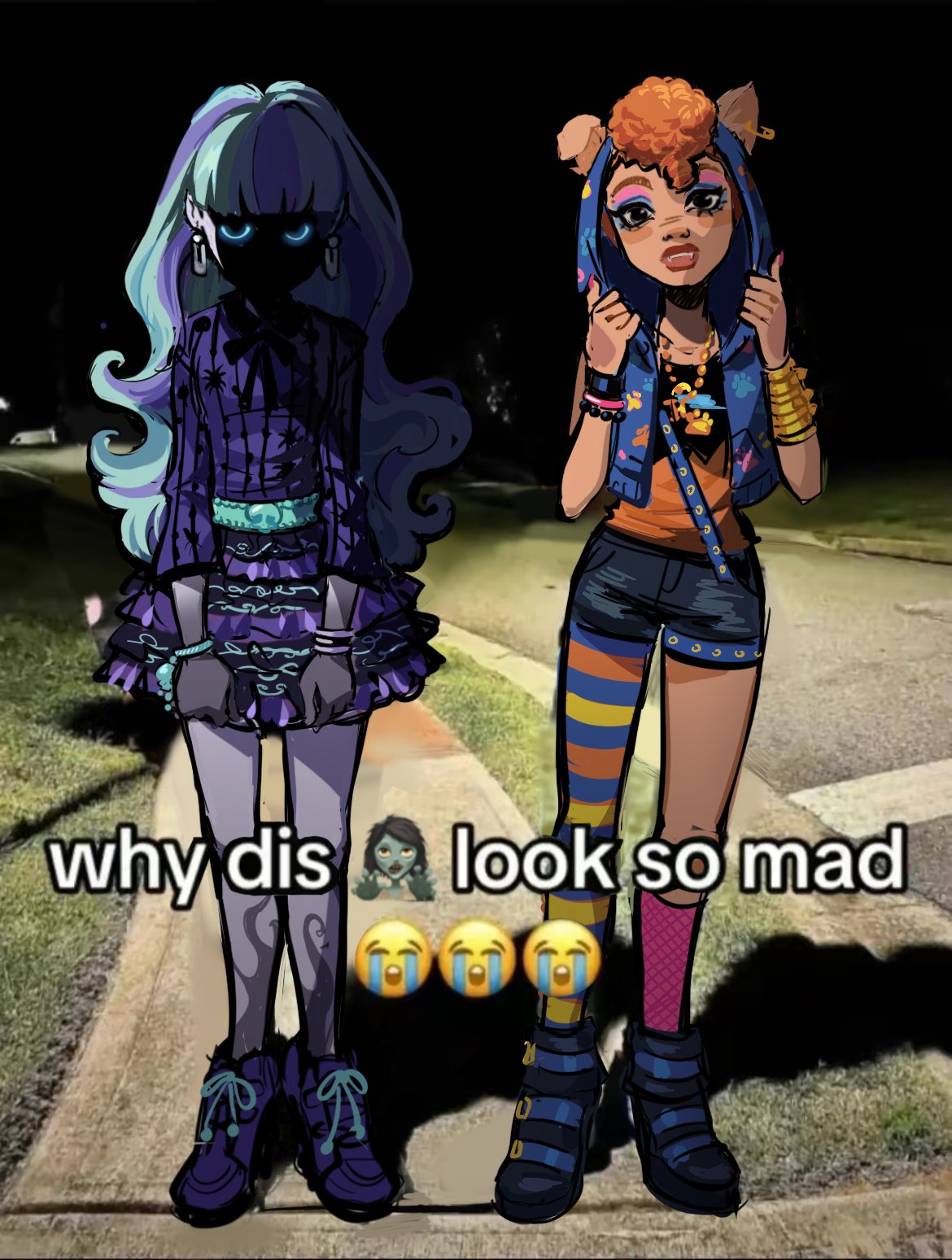 2girls animal_ear_fluff animal_ears animal_print armband black_armband black_bow black_eyes black_footwear black_shorts blue_hoodie blue_sclera bow bracelet chain claws colored_sclera colored_skin curly_hair earrings english_text fangs fishnets glow-in-the-dark glowing glowing_eyes gold_bracelet gold_chain gold_necklace highres hood hoodie horizontal-striped_thighhighs howleen_wolf jewelry layered_skirt long_hair long_sleeves looking_at_viewer meme mistyxxart monster_girl monster_high monster_high_(g1) multicolored_hair multicolored_thighhighs multiple_girls necklace night open_clothes open_hoodie open_mouth orange_hair paw_print paw_print_pattern photo_background pink_nails pink_socks purple_footwear purple_hair purple_shirt purple_skin purple_skirt shaded_face shirt short_shorts shorts single_thighhigh skirt sleeveless sleeveless_hoodie sleeveless_shirt socks spider_print standing striped_clothes striped_thighhighs thighhighs two-tone_shirt twyla_boogeyman werewolf why_dis_ninja_look_so_mad_(meme) wolf_ears wolf_girl