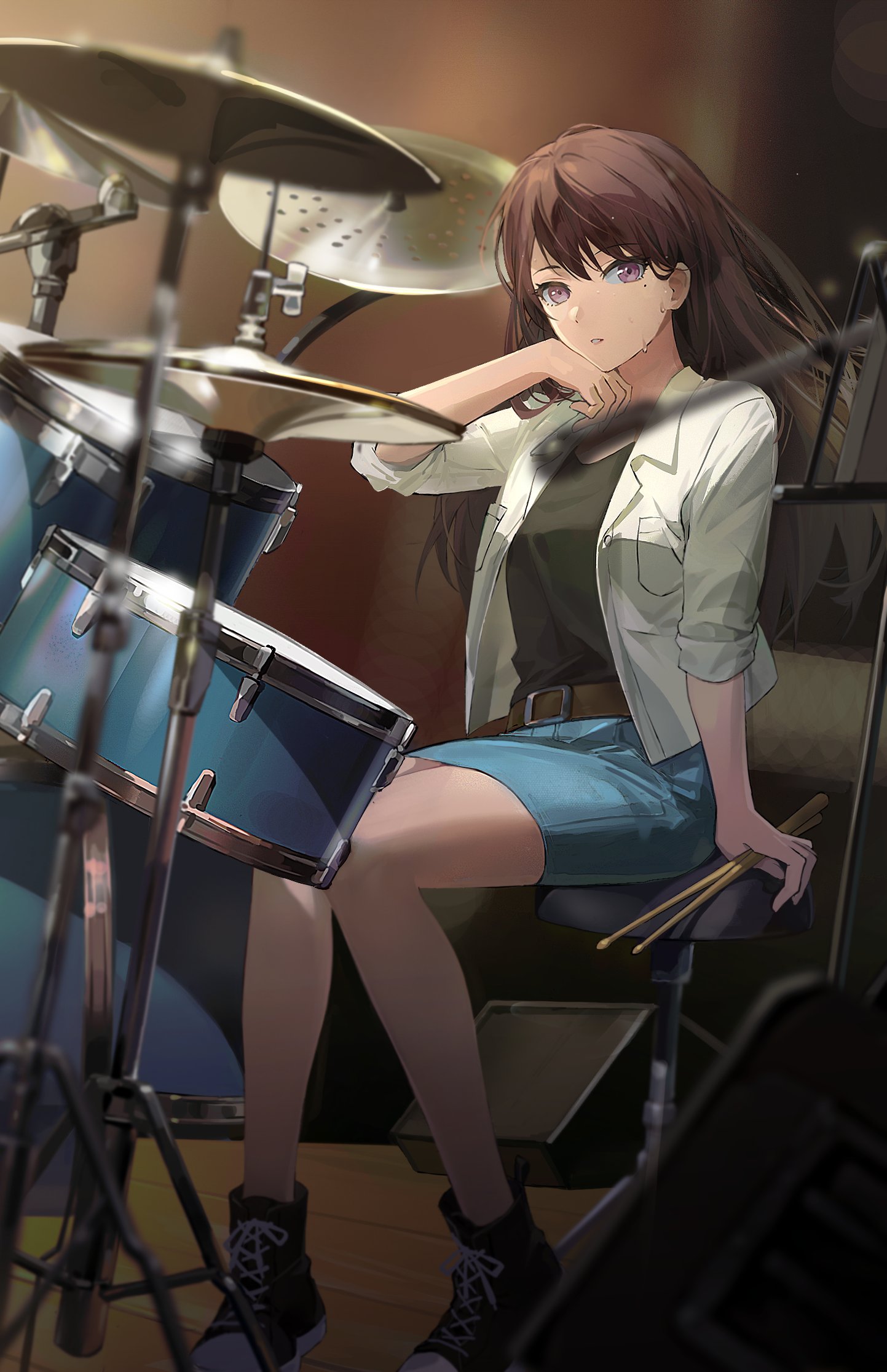 1girl bang_dream! bang_dream!_it's_mygo!!!!! belt belt_buckle black_shirt blue_skirt blurry blush brown_belt brown_hair buckle commentary depth_of_field drum drum_set drumsticks hand_up hashtag-only_commentary highres holding holding_drumsticks instrument jacket long_hair mole mole_under_eye open_clothes open_jacket open_mouth purple_eyes shiina_taki shirt sitting skirt three-quarter_sleeves solo sweat white_jacket wiping_sweat yannn