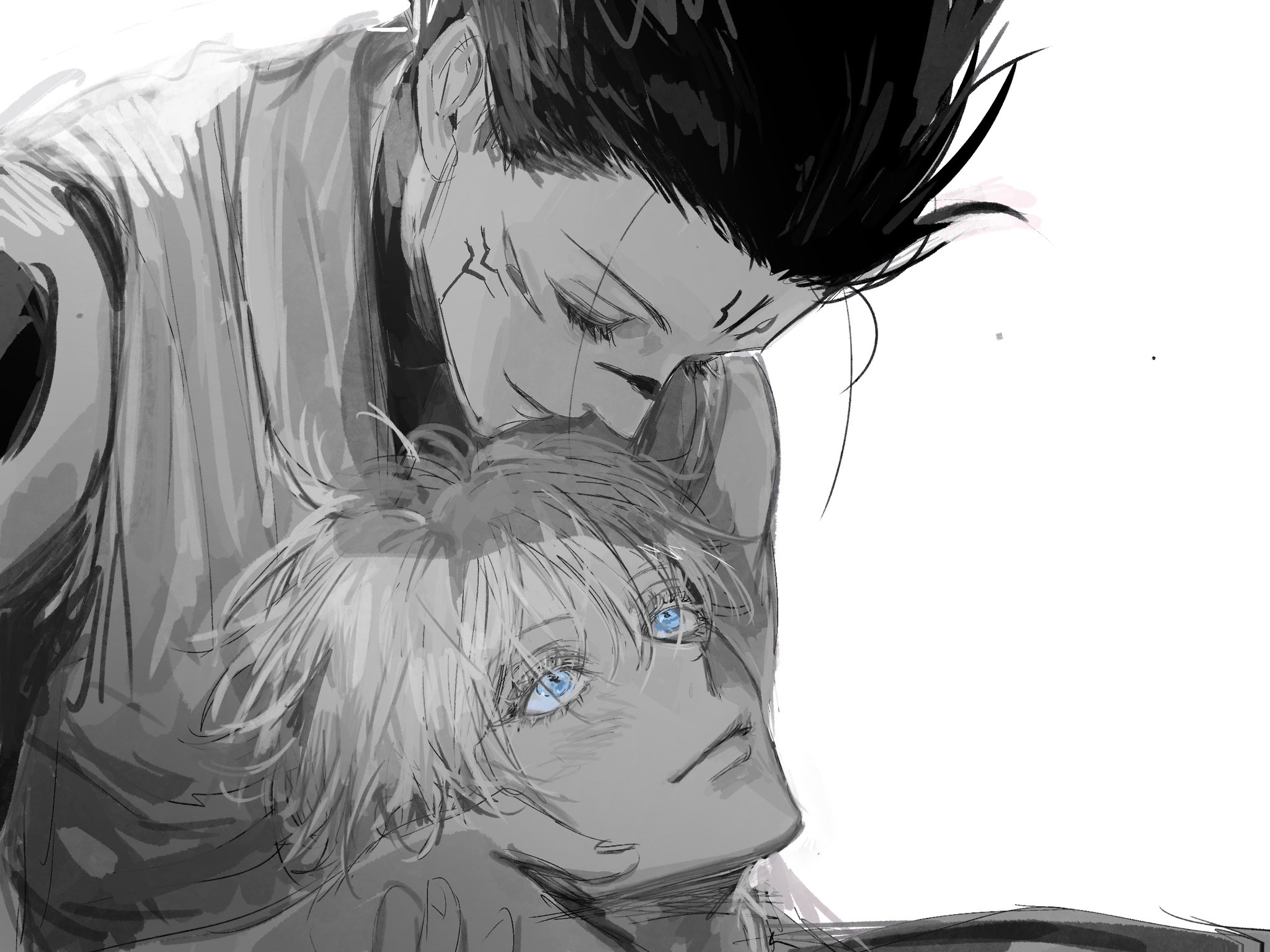 2boys black_hair blue_eyes blush extra_eyes eye_contact facial_tattoo fallsoki forehead_tattoo gojo_satoru greyscale hand_on_another's_head highres jujutsu_kaisen limited_palette long_eyelashes looking_at_another looking_down looking_up male_focus monochrome multiple_boys ryoumen_sukuna_(jujutsu_kaisen) short_hair shoulder_tattoo smile spiked_hair tattoo white_hair yaoi